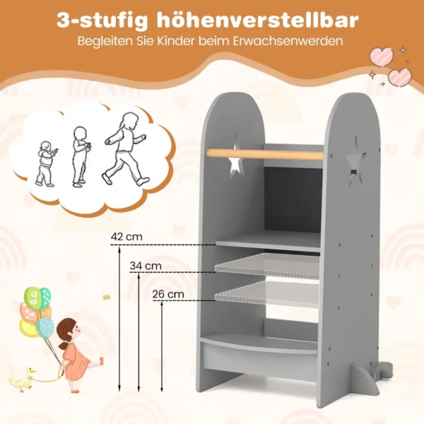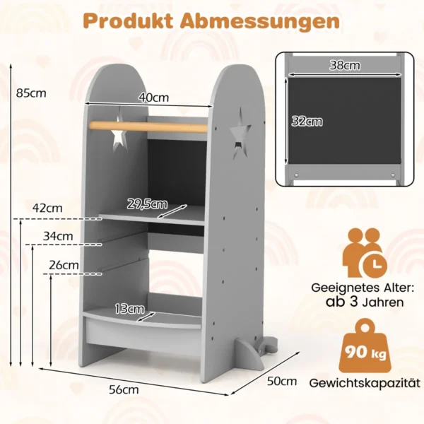 Virtuvės bokštelis 56x50x85cm, pilkos spalvos, skirtas vaikams nuo 3 metų padeda saugiai pasiekti aukštesnes zonas virtuvėje ar kitose namų erdvėse. Dėl reguliuojamo aukščio ir saugos funkcijų jis pritaikytas įvairaus amžiaus ir ūgio vaikams kasdienėms užduotims atlikti.