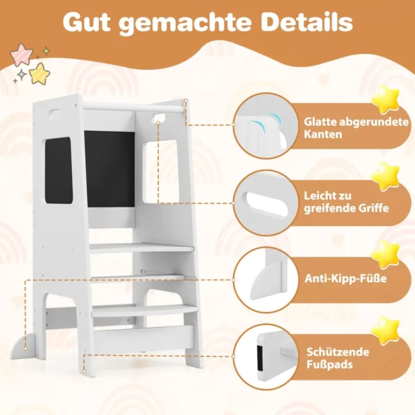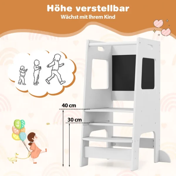 Virtuvės bokštelis 60x49x91,5cm, baltos/juodos spalvos – funkcionali ir saugi vaikų kėdutė, skirta padėti mažiesiems pasiekti stalviršius ir kriaukles. Medinis bokštelis su reguliuojama platforma ir integruotomis lentomis tinka saugiam kasdieniam naudojimui virtuvėje ar kitose namų erdvėse.