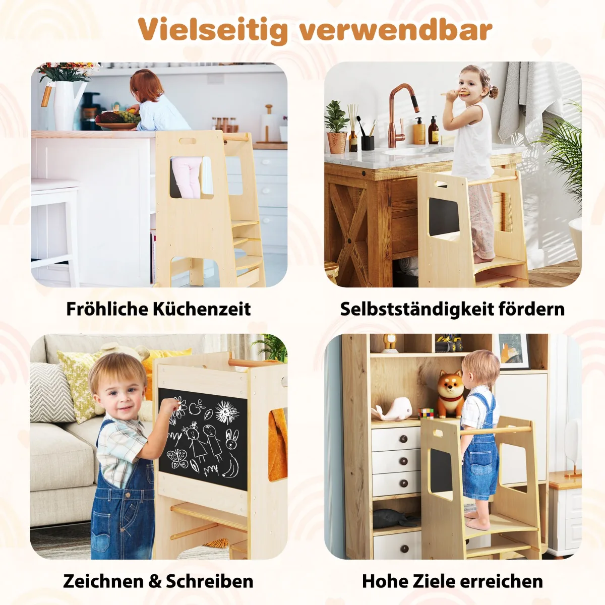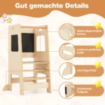 Virtuvės bokštelis 60x49x91,5 cm šviesiai rudos ir juodos spalvos skirtas vaikams nuo 1 metų. Tai universali medinė konstrukcija, leidžianti vaikams saugiai pasiekti stalviršį ar kriauklę bei skatinti kūrybiškumą ir savarankiškumą įvairiose veiklose virtuvėje ir namuose.