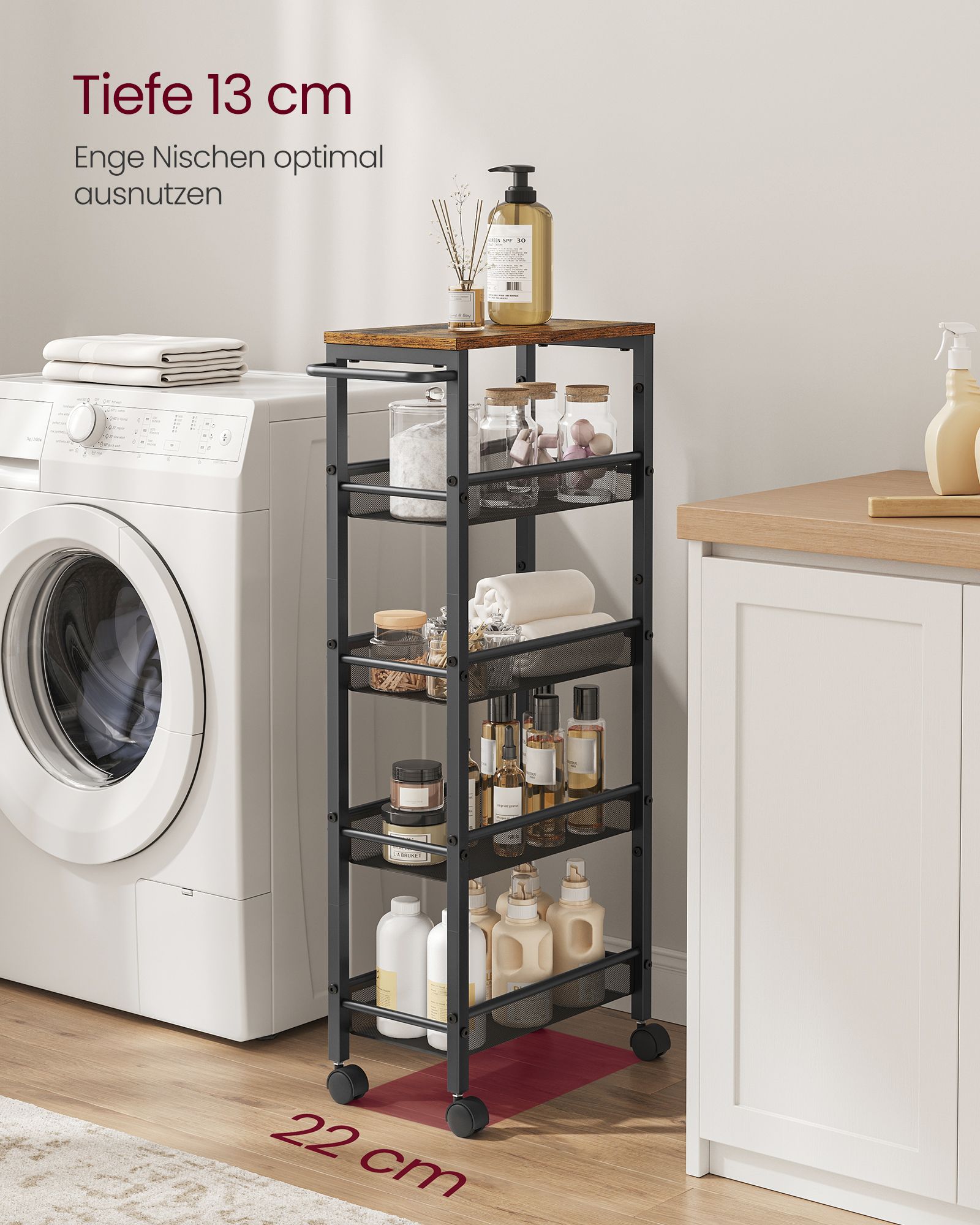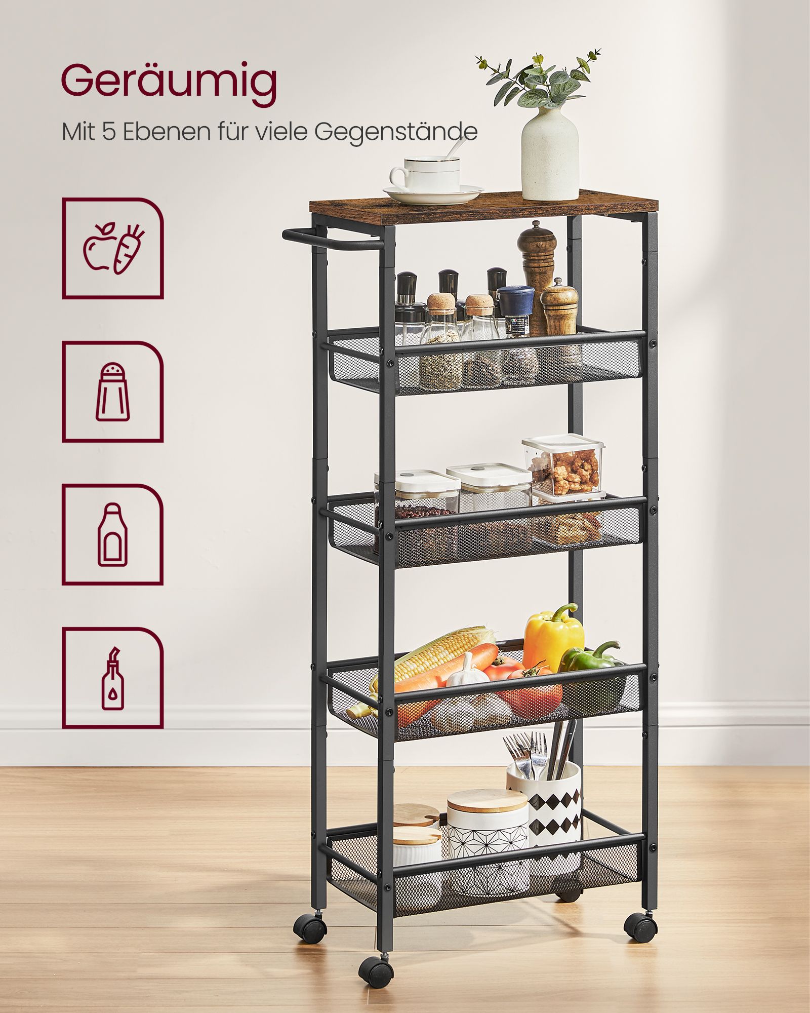 Ši virtuvės lentyna yra pagaminta iš aukštos kokybės medžiagų, užtikrinančių ilgaamžiškumą ir stabilumą. Jos kompaktiškas dydis leidžia lengvai pritaikyti net ir mažesnėse erdvėse, o vintažinė ruda-juoda spalvų kombinacija suteikia elegancijos ir šilumos jūsų virtuvei.