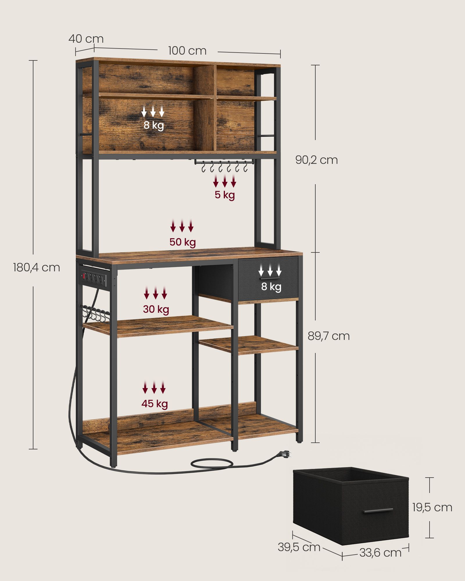 Pagaminta iš aukštos kokybės medžio drožlių plokštės ir plieno, ši lentyna yra tvirta ir ilgaamžė. Bendras dydis yra 40 x 100 x 180,4 cm, o svoris siekia 27,2 kg.