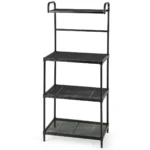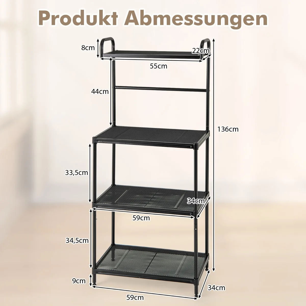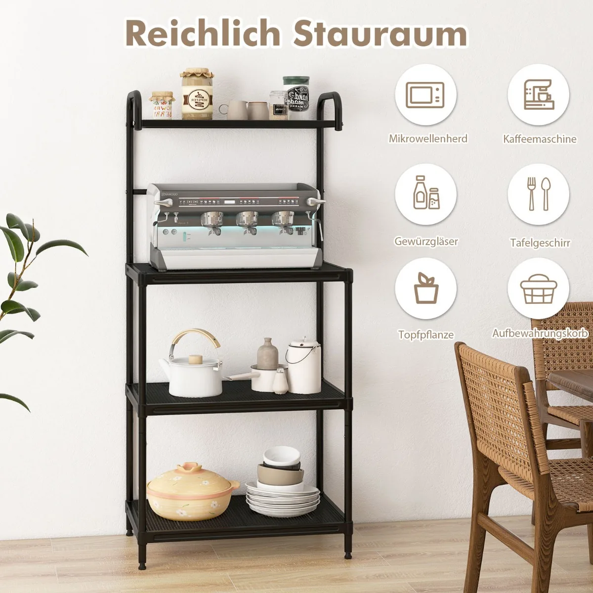 • Juodos spalvos virtuvės lentyna su keturiomis pakopomis, tinkama indams, prieskoniams bei mikrobangų krosnelei laikyti.
