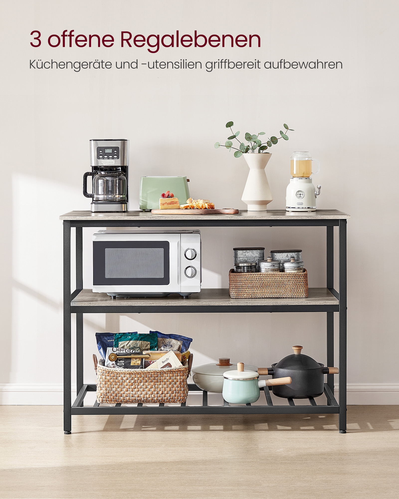 Modernus juodos ir pilkos spalvų derinys suteikia lentynai universalumo, todėl ji puikiai derės prie bet kokio interjero stiliaus. Nesvarbu, ar jūsų virtuvė yra klasikinė, ar moderni, ši lentyna taps puikiu papildymu.