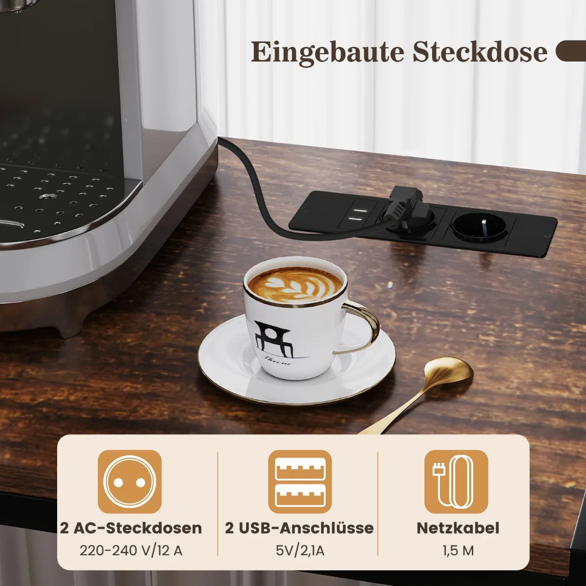 - Integruota įkrovimo stotelė su dviem kintamosios srovės lizdais ir dviem USB prievadais leidžia patogiai įkrauti elektroninius įrenginius.
