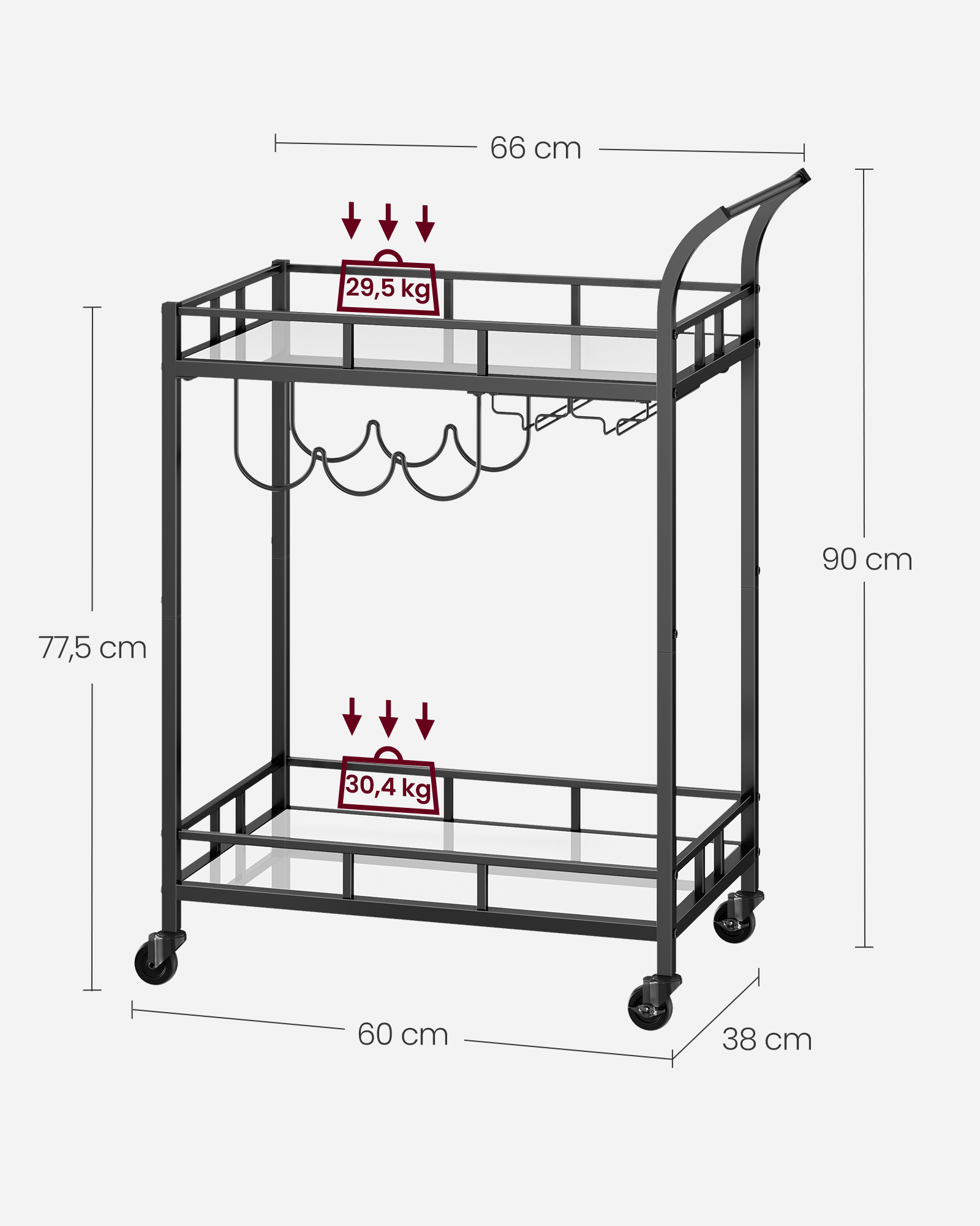 • Maksimali apatinės lentynos statinė apkrova: 30,4 kg