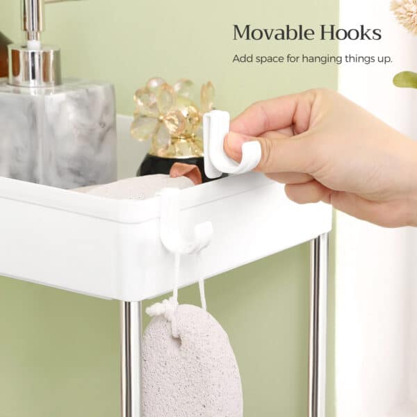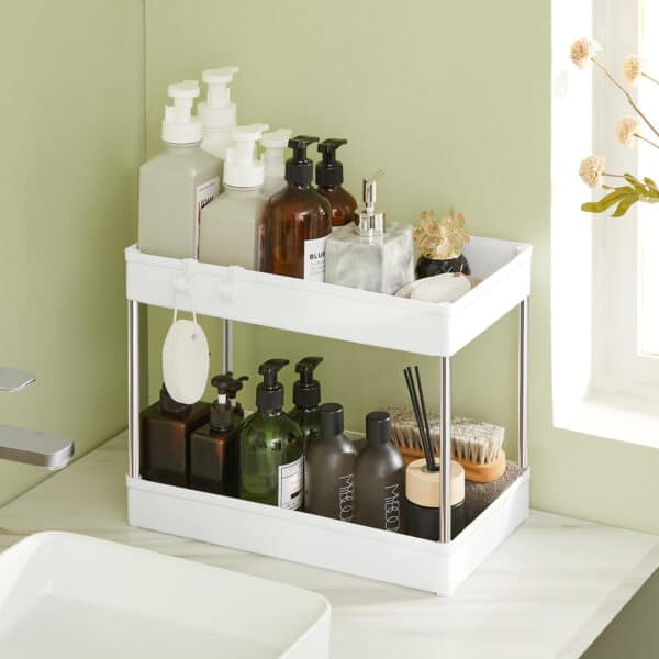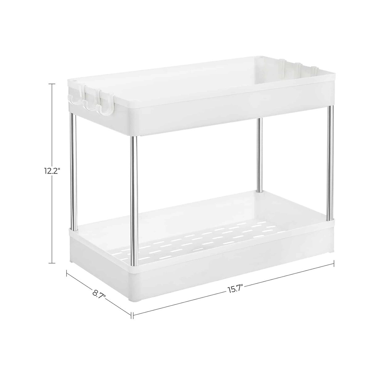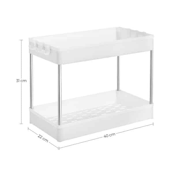Šis virtuvės organizatorius, baltos spalvos, yra puikus sprendimas tvarkai palaikyti jūsų virtuvėje. Pagamintas iš aukštos kokybės PP plastiko (polipropileno) ir nerūdijančio plieno vamzdžių, jis yra patvarus ir ilgaamžis.
