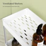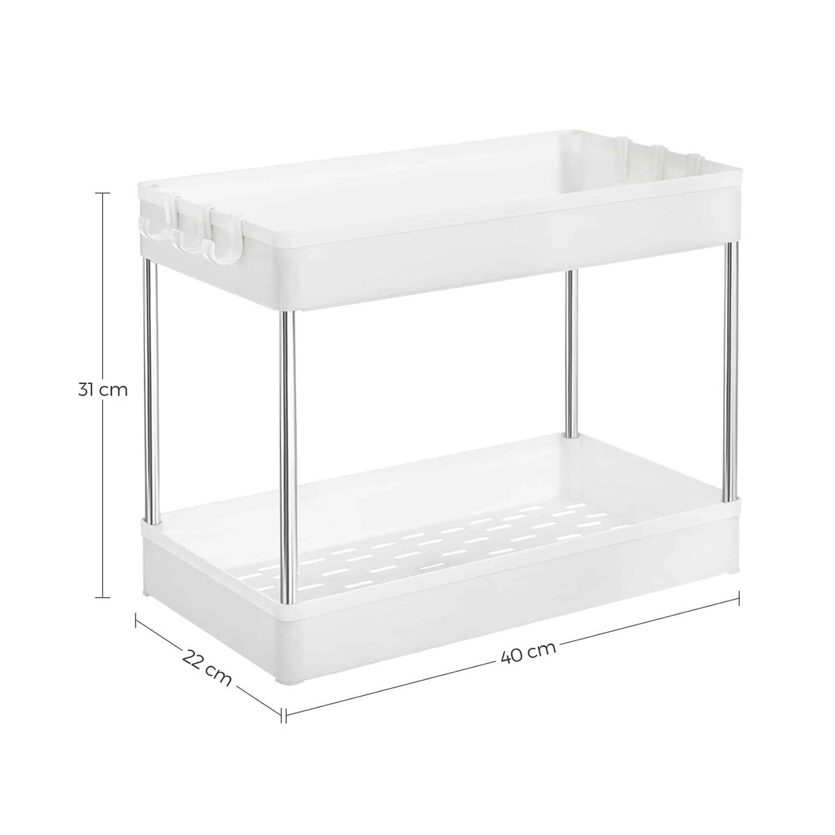 Organizatoriaus matmenys yra 40 x 22 x 31 cm , o jo svoris siekia tik 0,6 kg, todėl jis yra lengvas ir lengvai perkeliamas. Kiekviena lentyna gali atlaikyti iki 5 kg statinę apkrovą, todėl galite saugiai laikyti įvairius virtuvės reikmenis.