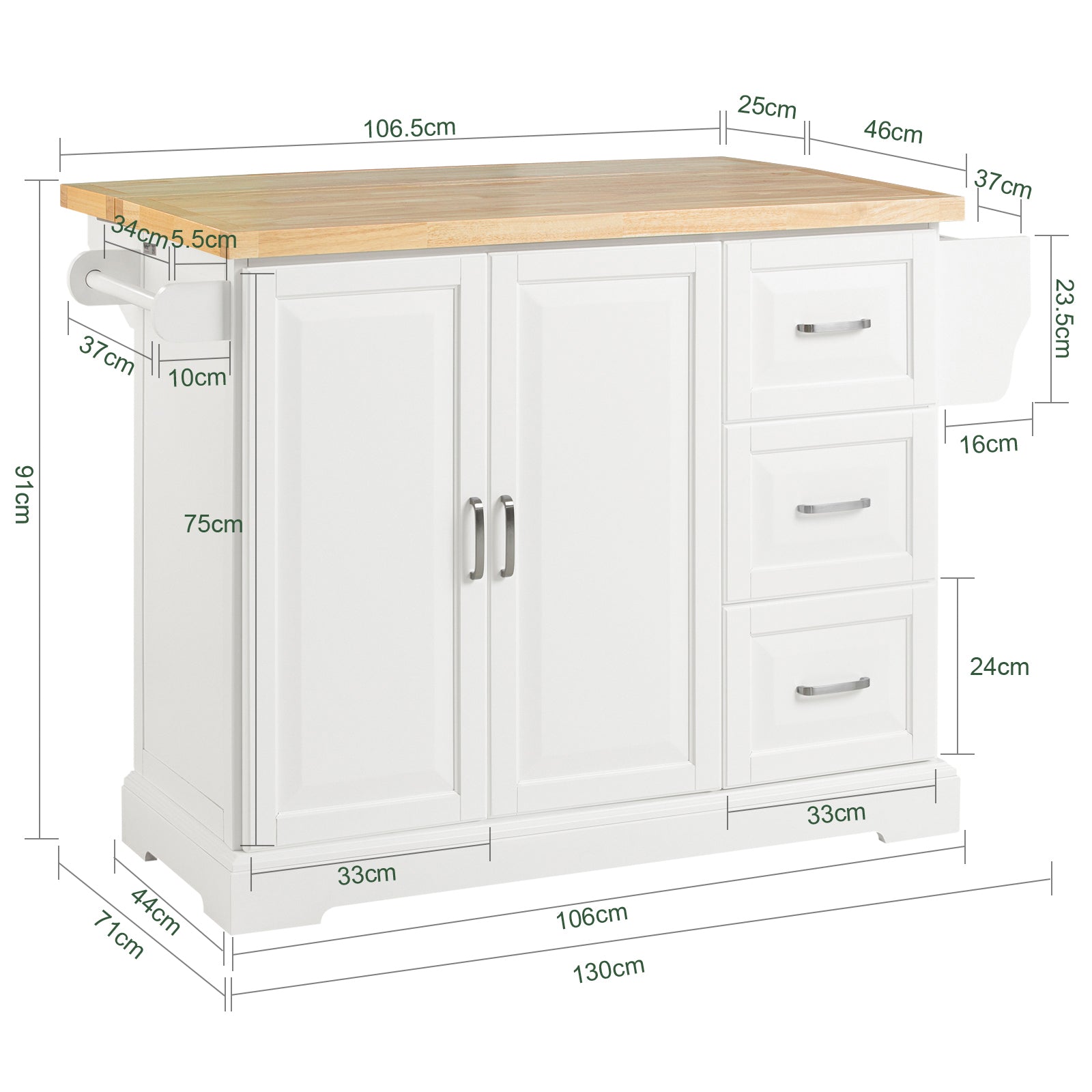 Virtuvės sala 130x71x91cm, baltos/šviesiai rudos spalvos, yra puikus sprendimas jūsų virtuvei. Jos medinė stalviršio dalis suteikia šilumos ir rustiškumo jūsų interjerui, o universalus dizainas leidžia lengvai pritaikyti šią salą įvairiems poreikiams ir derinti su kita virtuvės įranga.