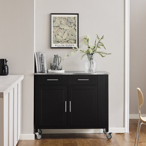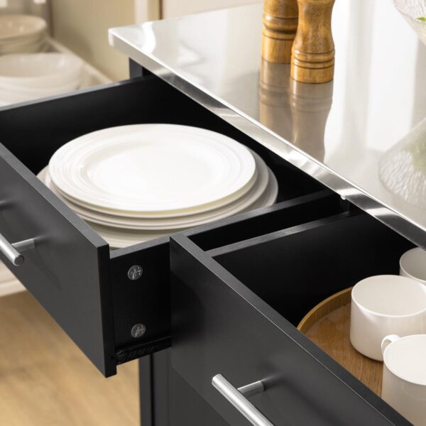 Ši virtuvės sala ant ratukų, kurios matmenys yra 107x46x94 cm, juodos ir sidabrinės spalvos, yra puikus sprendimas jūsų virtuvės erdvės optimizavimui. Didelė dėžė ir erdvus spintelės skyrius puikiai tinka įrankių ir stiklo laikymui. Gerai organizuota virtuvės sala taip pat turi rankšluosčių laikiklį ir prieskonių lentynėlę.