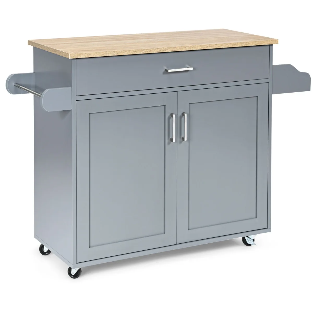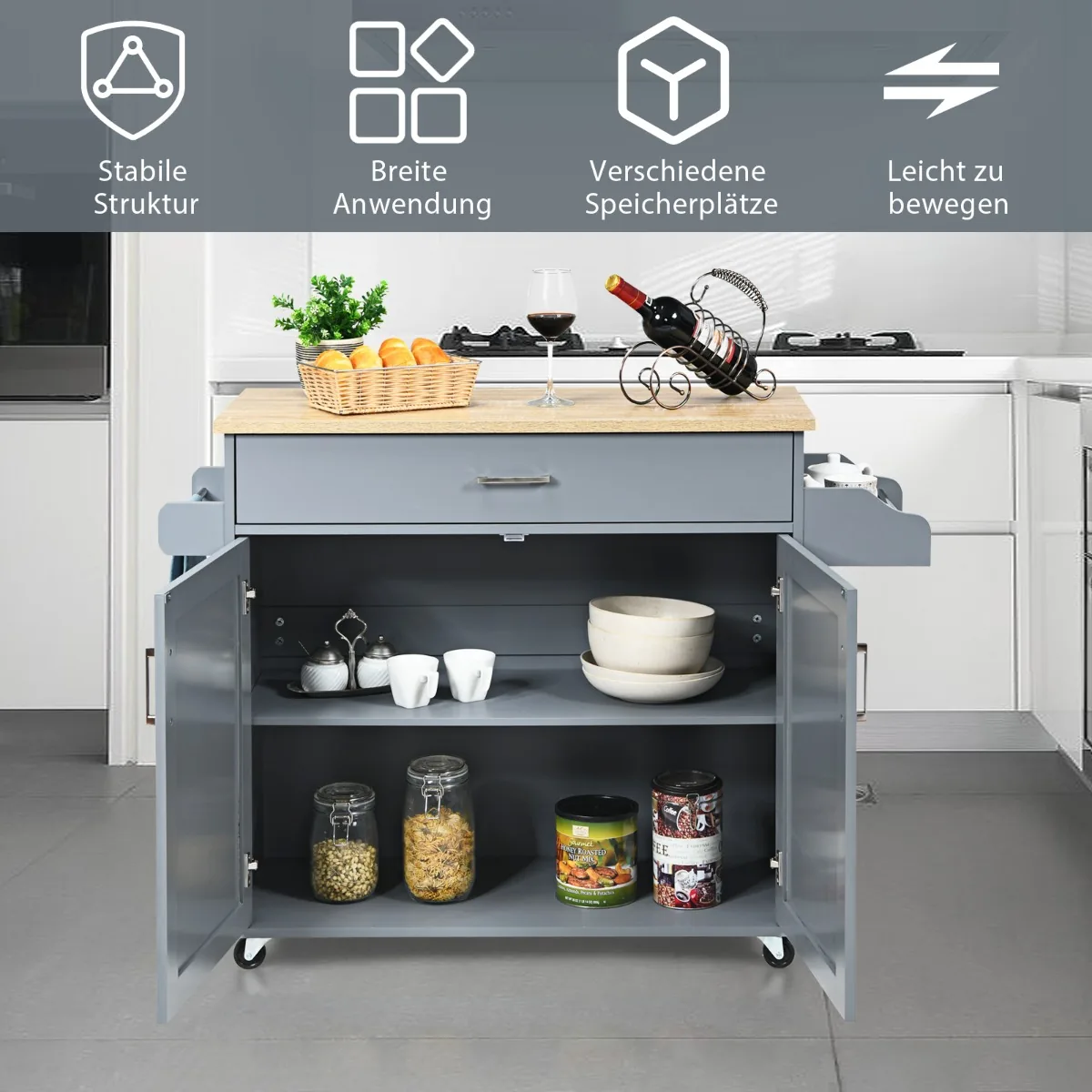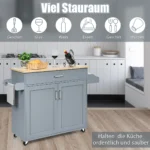 Virtuvės sala ant ratukų 116x40x85cm, pilkos ir šviesiai rudos spalvos, padeda efektyviai organizuoti vietą virtuvėje. Šis mobilus virtuvės vežimėlis suteikia papildomą darbo paviršių, saugojimo erdvę ir patogumą judant. Tinkamas laikyti indus, prieskonius, rankšluosčius bei kitus virtuvės reikmenis.
