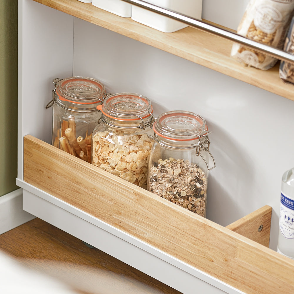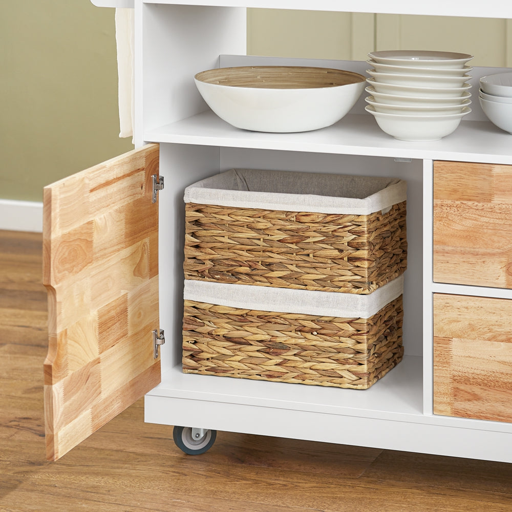 Ši virtuvės sala ant ratukų, kurios matmenys yra 119x55x90 cm, baltos ir šviesiai rudos spalvos, yra puikus sprendimas jūsų virtuvės organizavimui ir funkcionalumui. Ji turi plačią stalviršį, dvi prieskonių lentynas, šoninę rankšluosčių laikiklį, uždarą spintelę ir dvi gilias stalčius, kurios leidžia patogiai laikyti vynus, stiklines, indus, prieskonius, maistą ar virtuvės reikmenis.