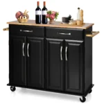 Virtuvės sala ant ratukų 122x48x93cm, juodos ir šviesiai rudos spalvos, yra funkcionalus ir patogus sprendimas maisto ruošimui ir saugojimui. Šis virtuvės vežimėlis su dideliu stalviršiu ir įvairiomis saugojimo galimybėmis pritaikytas įvairioms virtuvės erdvėms.