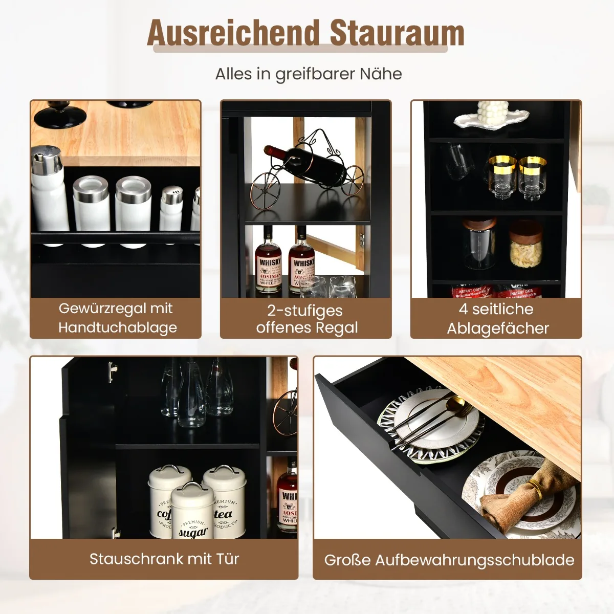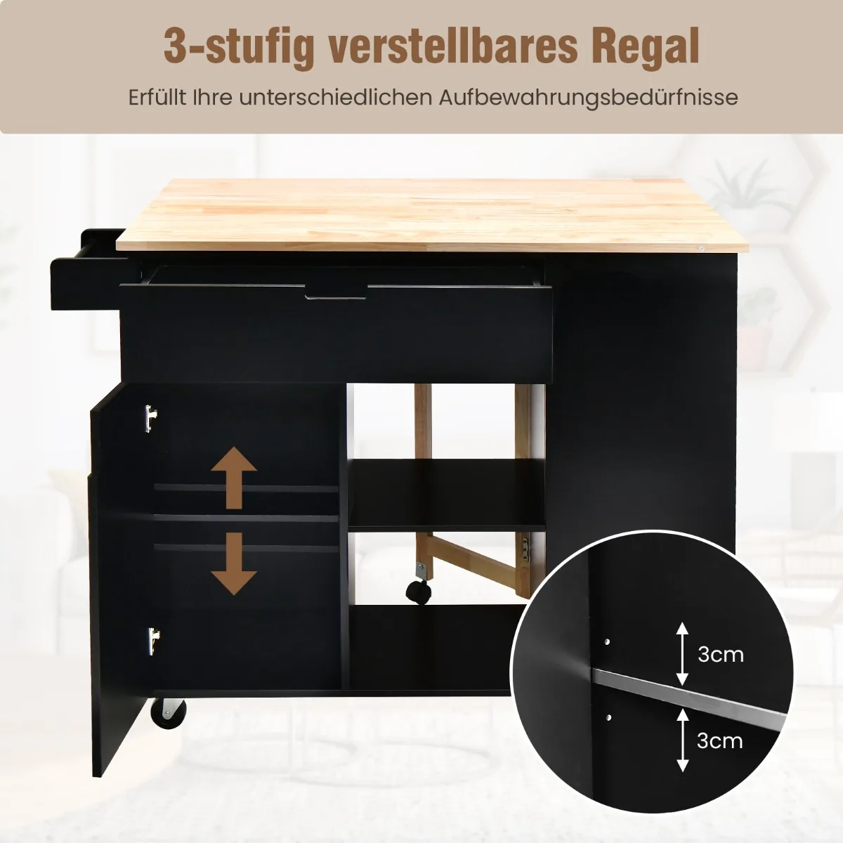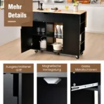 Virtuvės sala ant ratukų 124x76x92cm, juodos ir šviesiai rudos spalvos, suteikia papildomą darbo ir laikymo vietą jūsų virtuvėje. Šis daugiafunkcis vežimėlis leidžia patogiai ruoštis maistui, laikyti indus bei prieskonius ir lengvai judėti pagal poreikį.