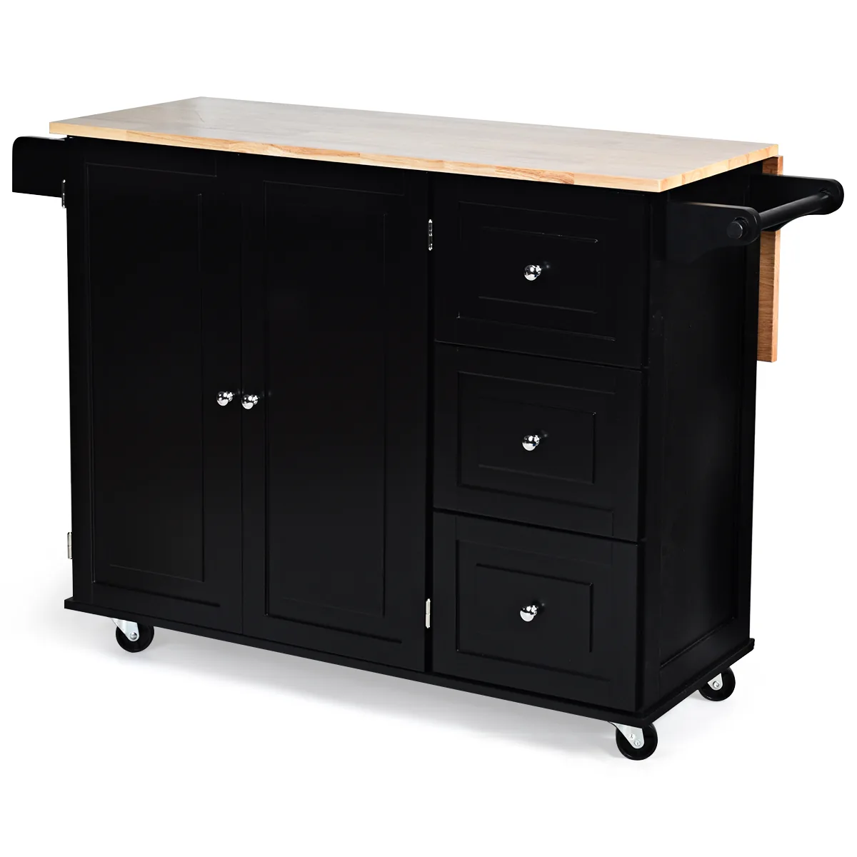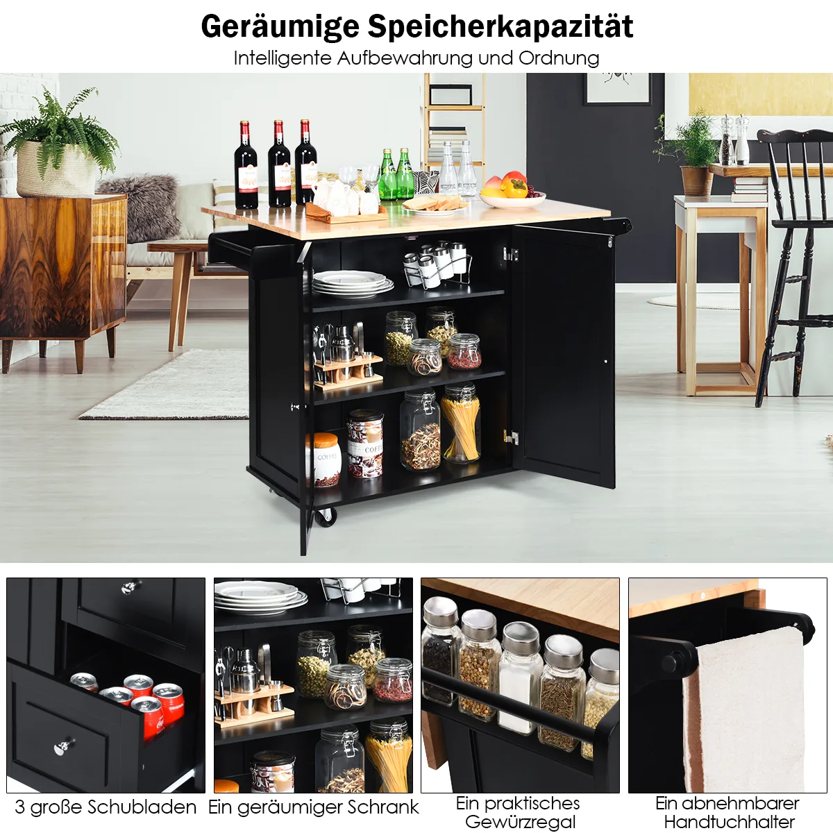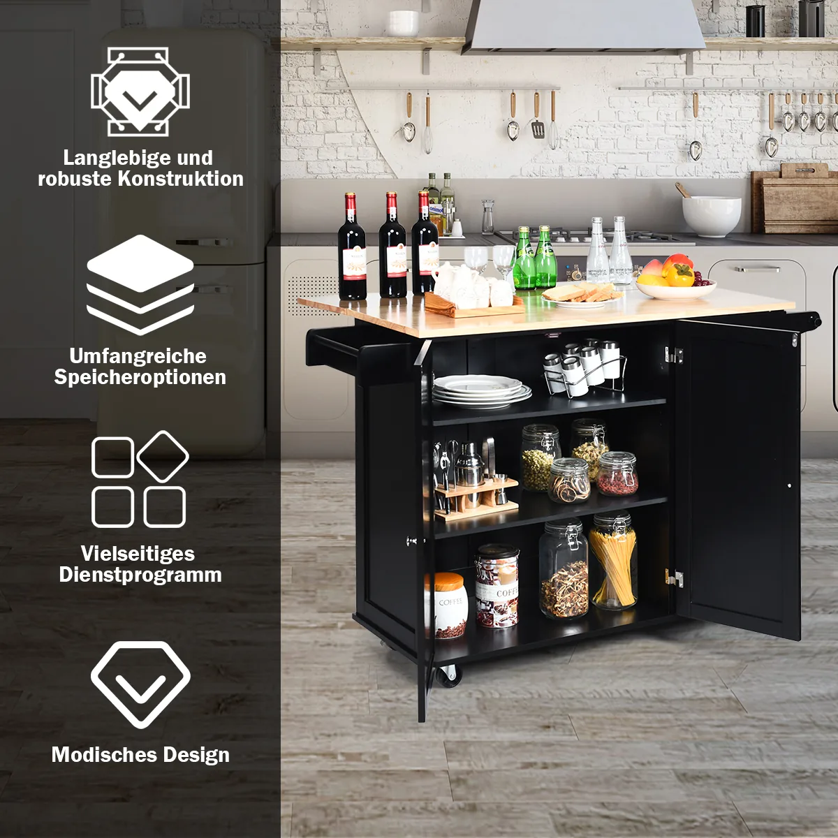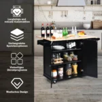 Virtuvės sala ant ratukų 136x76x91cm, juodos ir šviesiai rudos spalvos, padės išlaikyti tvarką ir patogumą virtuvėje. Šis virtuvinis vežimėlis suteikia daug vietos indams, prieskoniams ir kitiems virtuvės reikmenims, taip pat universalų darbinį paviršių su sulankstomu stalviršiu.