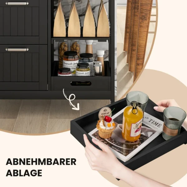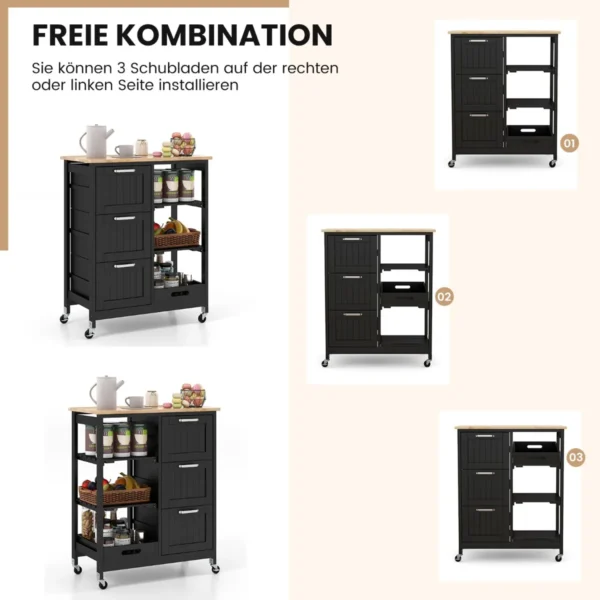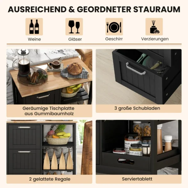 • Mobilioje virtuvės saloje yra 3 gilūs stalčiai, 2 atviros lentynos ir nuimamas padėklas patogiam patiekalų transportavimui.