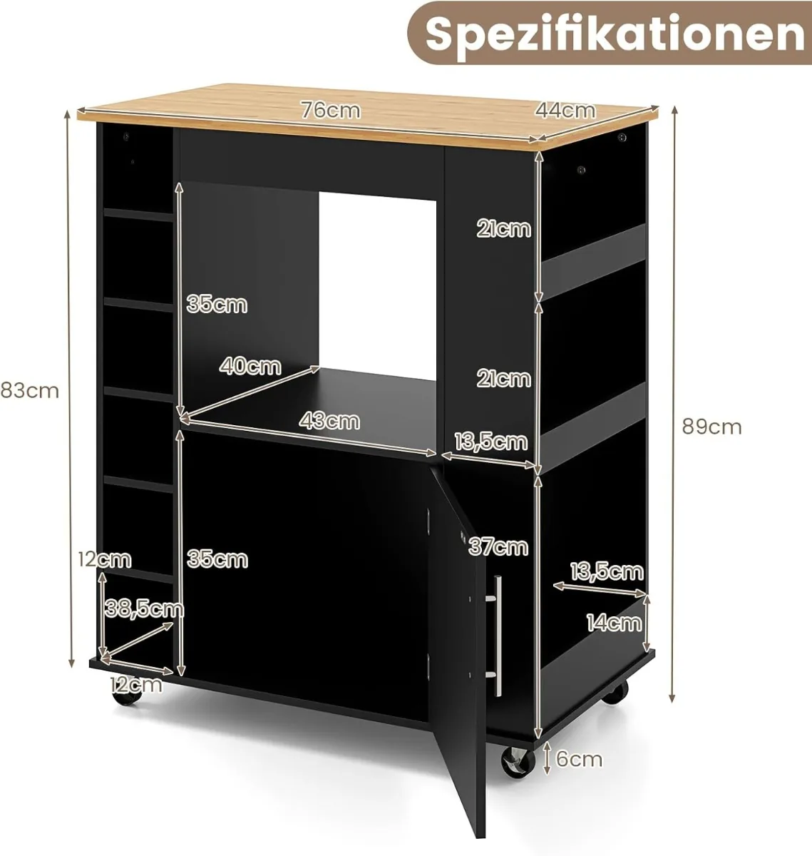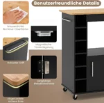 Virtuvės sala ant ratukų 76x44x89cm, juodos ir šviesiai rudos spalvos, suteikia praktišką sprendimą papildomai virtuvės erdvei. Tai pagalbinis vežimėlis su įvairiomis saugojimo vietomis ir mobilumo galimybėmis, tinkantis tiek maisto ruošimui, tiek indų laikymui.