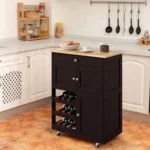 - Tvirtas virtuvinis vežimėlis su stalčiumi, trimis spintelės skyriais ir trijų lentynų vyno laikymui.