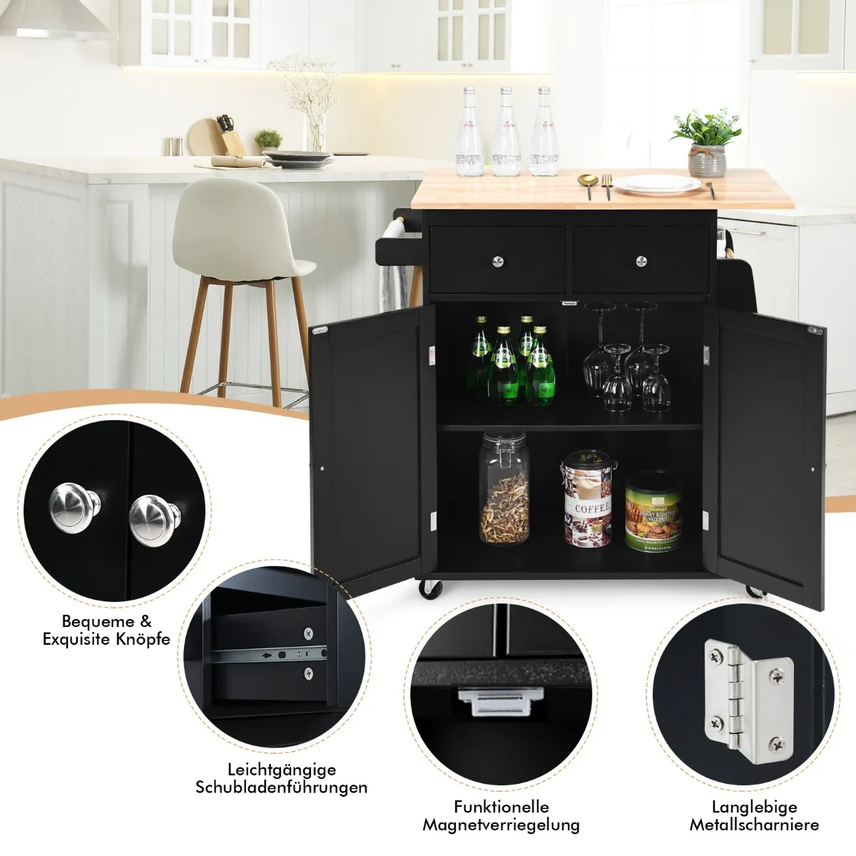 Virtuvės sala ant ratukų 88x45x89,5 cm, juodos ir šviesiai rudos spalvos, yra funkcionali ir praktiška pagalbinė erdvė maisto ruošimui bei virtuvės reikmenų laikymui. Ši mobili virtuvės sala atitinka įvairius saugojimo poreikius ir palengvina kasdienius virtuvės darbus.