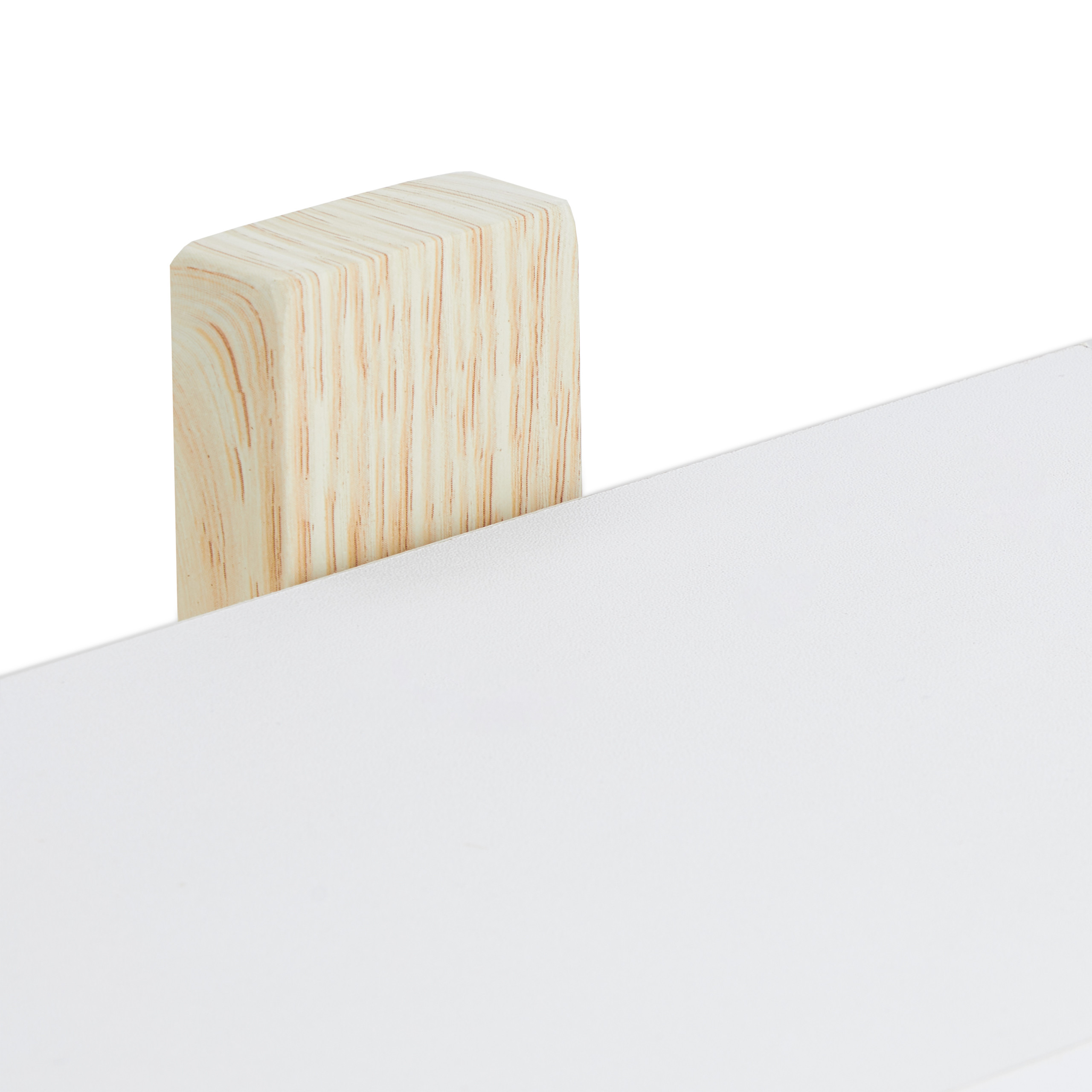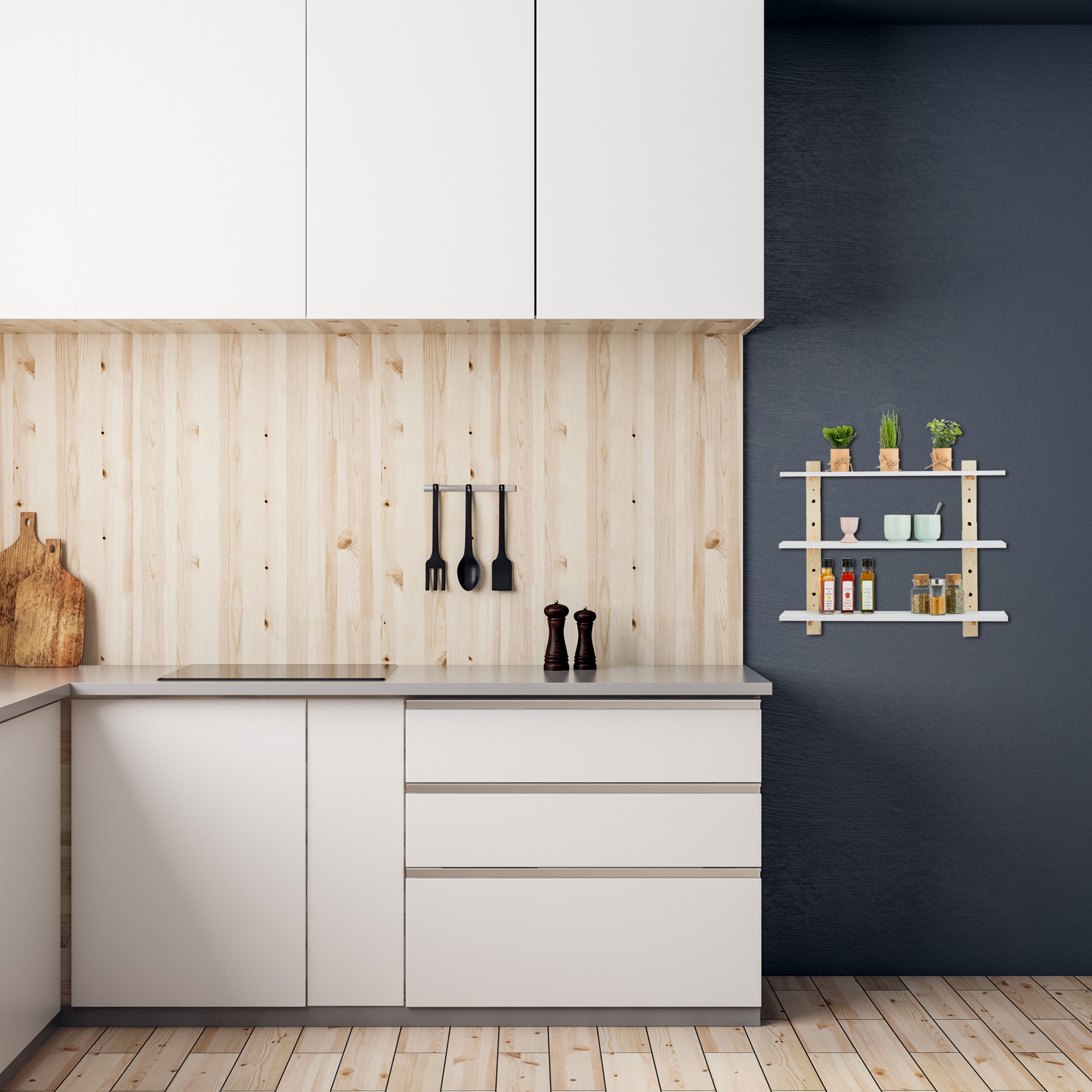Stilingas derinys: Šviesiai rudos medienos išvaizda kartu su baltomis lentynomis suteikia madingą išvaizdą.