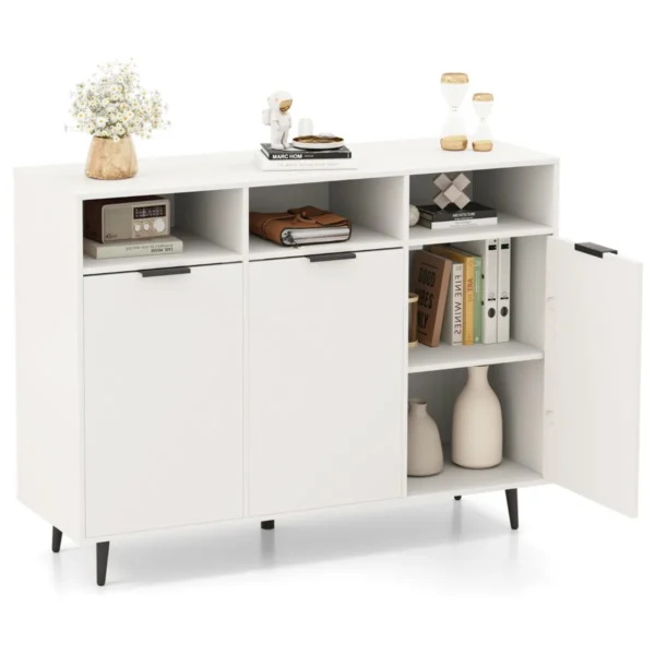 - Erdvus dizainas su plačia lentele, trimis atvirais skyreliais ir trimis spintelėmis su durelėmis.