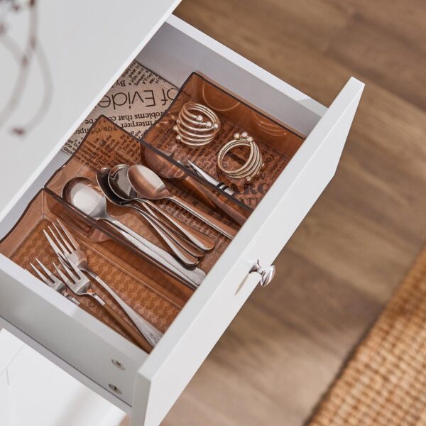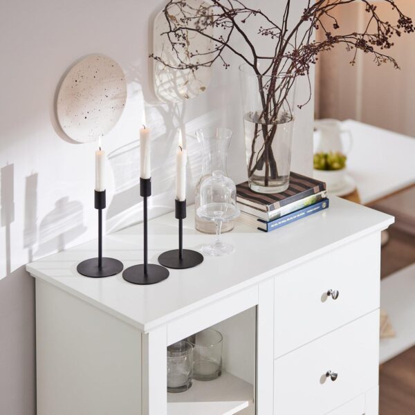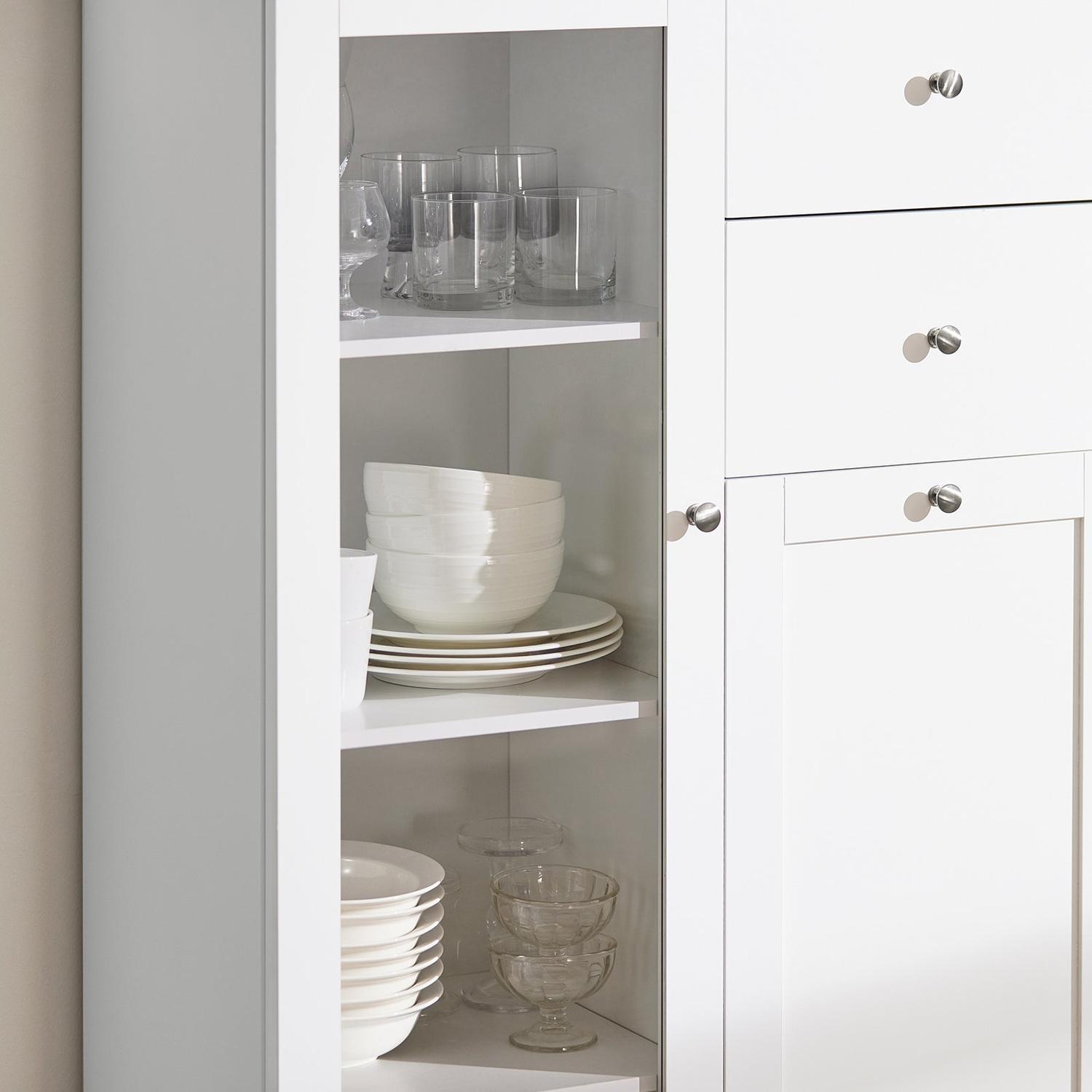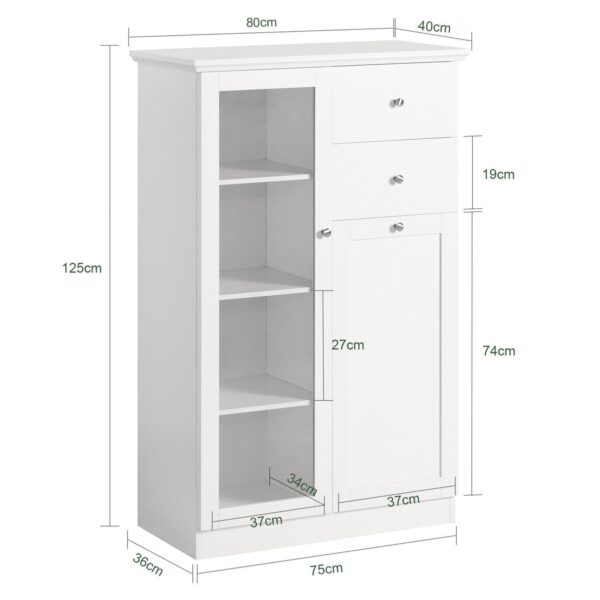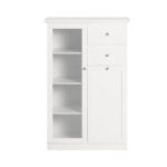 Spintelė turi vienas stiklines duris su septyniomis lentynomis ir dviem stalčiais, todėl ji puikiai tinka įvairiems daiktams laikyti. Klasikinis dizainas leidžia šią spintelę lengvai pritaikyti prie skirtingų interjero stilių.