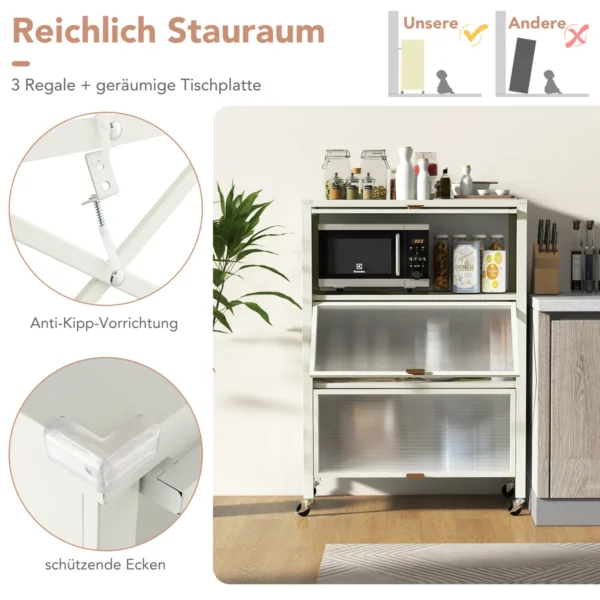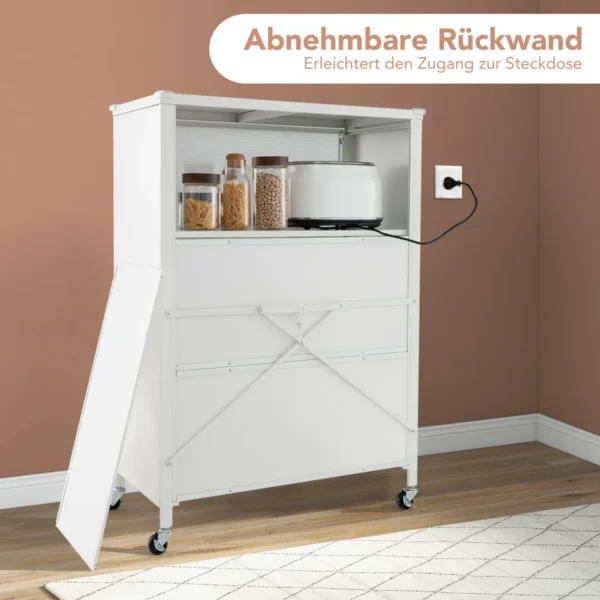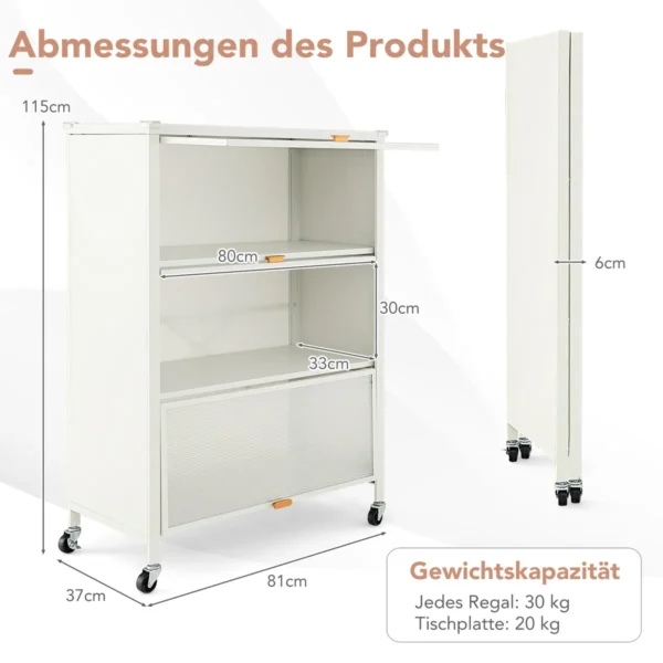 Virtuvės spintelė 81x37x115cm, baltos spalvos, yra funkcionalus sprendimas papildomam daiktų saugojimui ir organizavimui. Ši spintelė su keliais lentynų lygiais ir stalviršiu puikiai tinka laikyti virtuvės reikmenis, mikrobangų krosnelę ar kitus kasdienius daiktus. Mobilumas ir patvari konstrukcija užtikrina patogumą naudojant įvairiose namų patalpose.