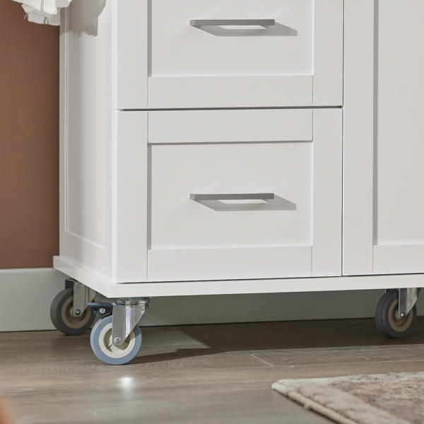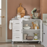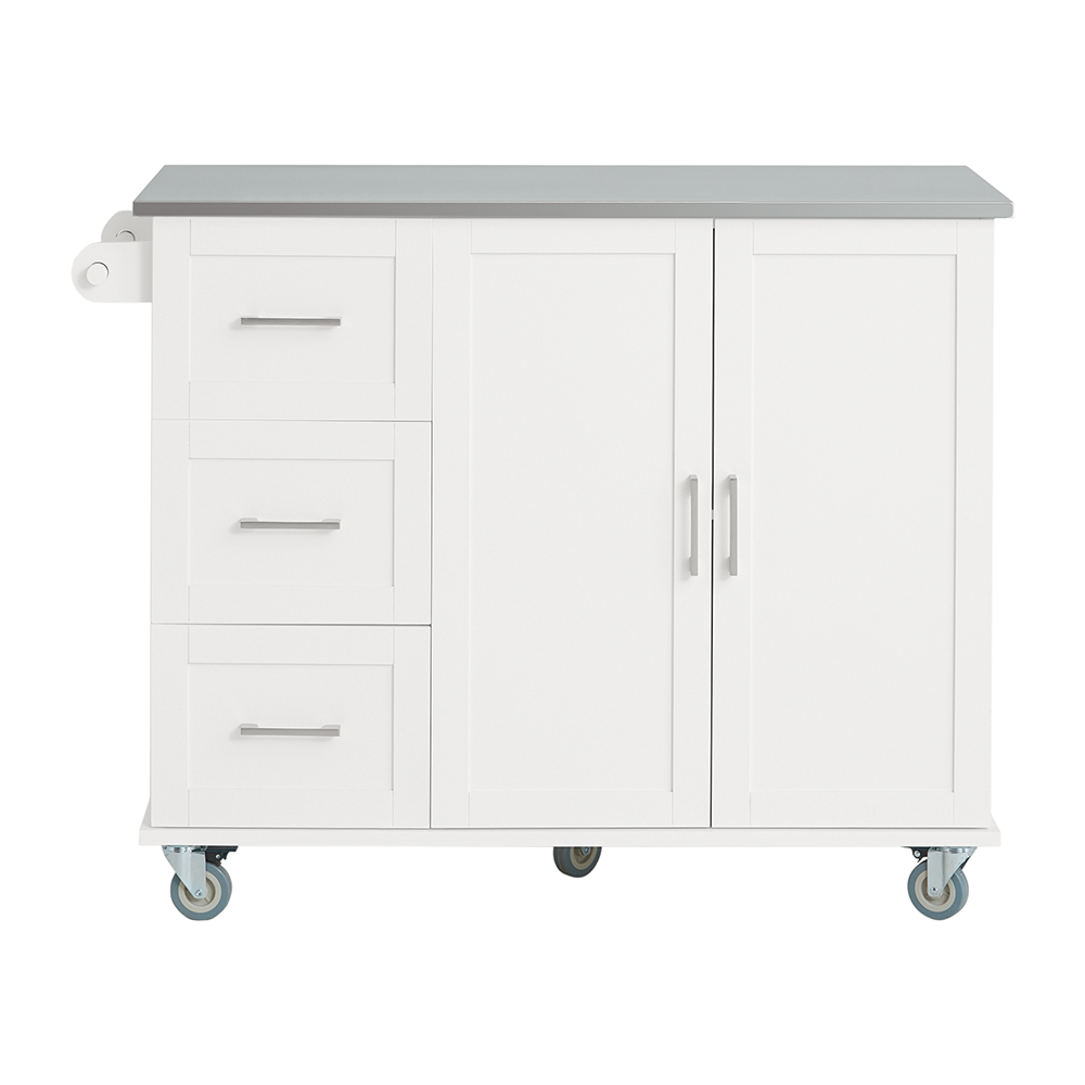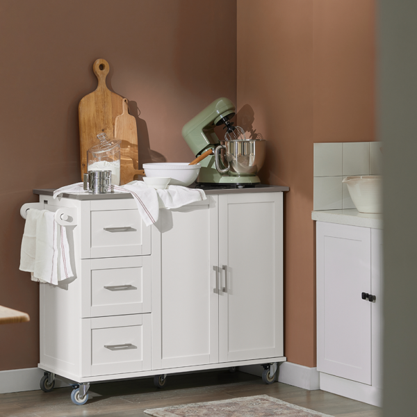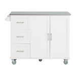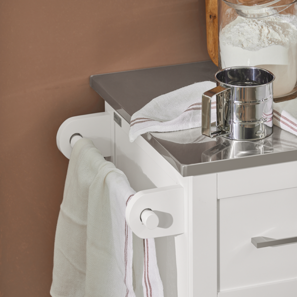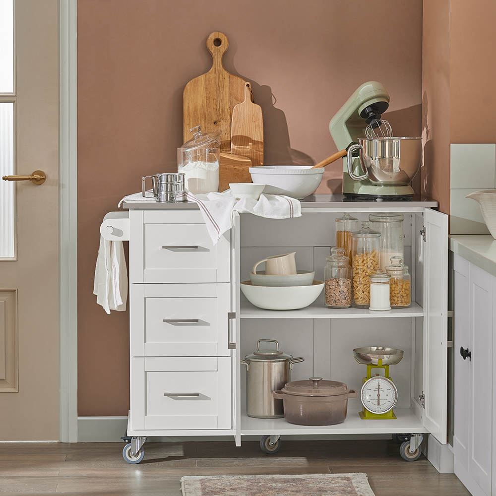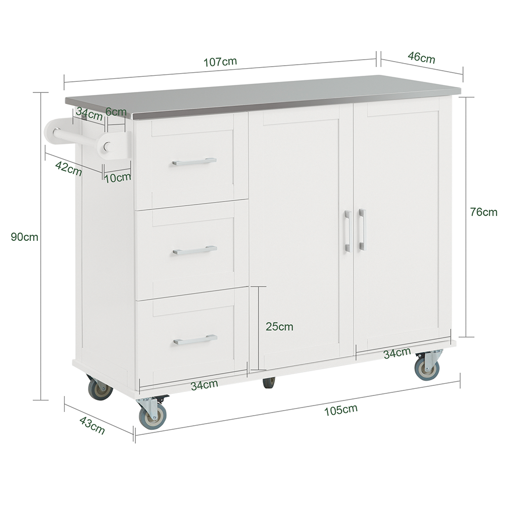 Šis virtuvės vežimėlis 107x46x90 cm, baltos/sidabrinės spalvos, yra puikus sprendimas jūsų virtuvės reikmenų, stalo įrankių ir stiklo dirbinių saugojimui. Didelė dėžė ir erdvus spintelės skyrius užtikrina, kad viskas bus laikoma saugiai ir švariai. Be to, vežimėlis turi rankšluosčių laikiklį, kuris leidžia patogiai pakabinti rankšluosčius.