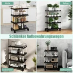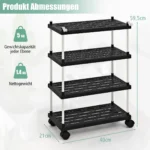 - Universalus laikymo vežimėlis su keturiais lentynų lygiais, tinkantis įvairiems daiktams – nuo indų ir maisto iki augalų ar užkandžių.