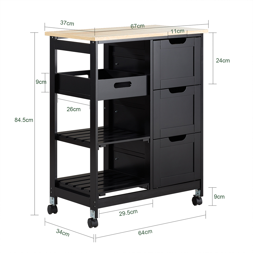 Šis virtuvės vežimėlis 67x37x84,5 cm, juodos ir šviesiai rudos spalvos, yra puikus sprendimas jūsų virtuvės erdvės optimizavimui. Jis suteikia elegancijos ir funkcionalumo jūsų interjerui, puikiai tinka mažoms virtuvėms.