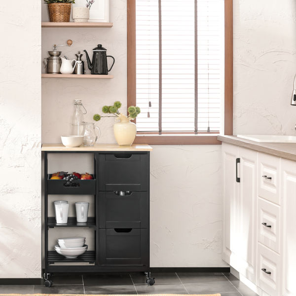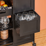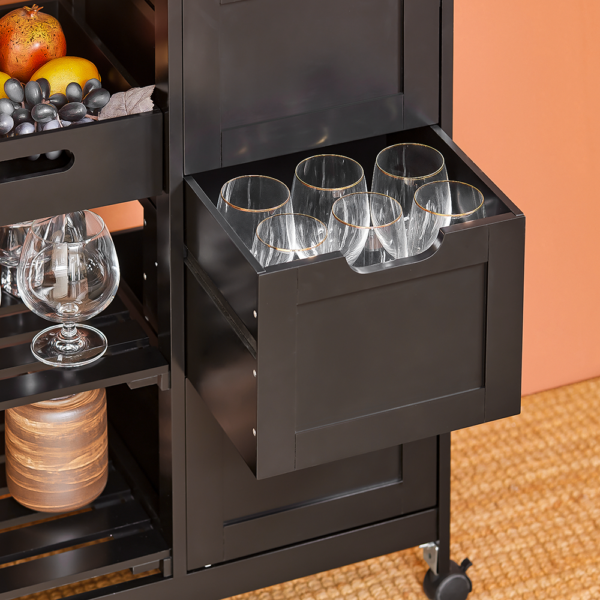 Vežimėlis turi pakankamai vietos jūsų mikrobangų krosnelei, espreso aparatui ir kitiems virtuvės prietaisams. Atvira lentyna leidžia lengvai pasiekti virtuvės reikmenis, o laikymo stalčius ir spintelė padeda išlaikyti daiktus tvarkingus ir švarius.