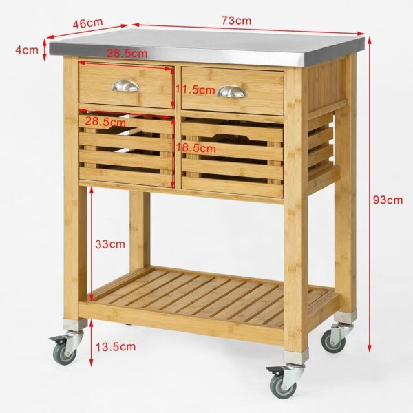Robustiška konstrukcija ir keturi ratukai leidžia lengvai perkelti vežimėlį ten, kur jums reikia, suteikiant papildomą laikymo, darbo ir paviršiaus plotą.
