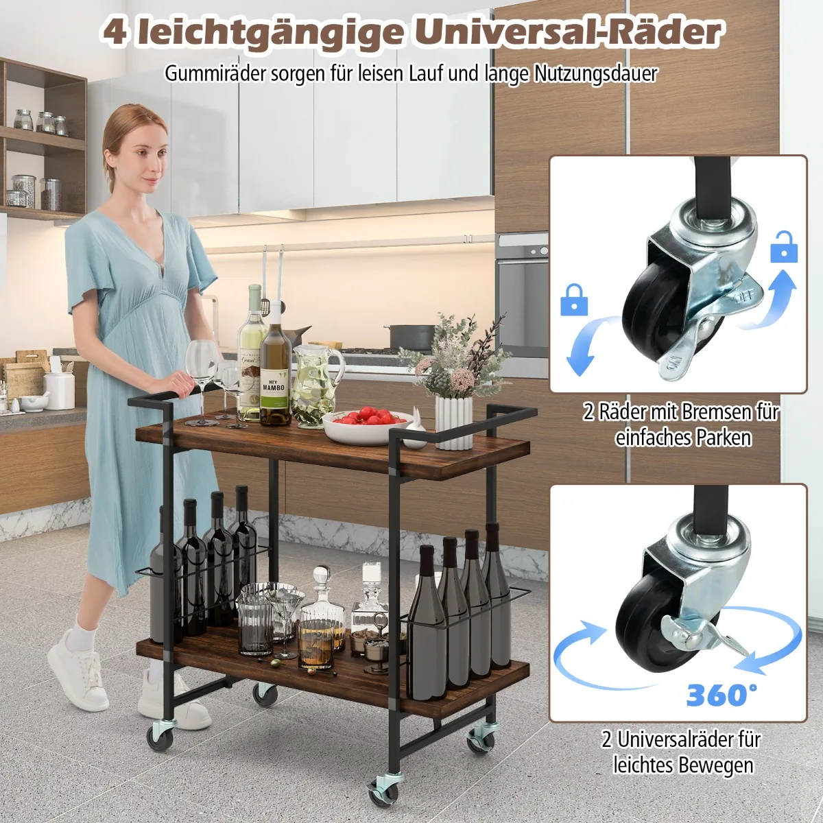 - Universalus naudojimas – virtuvės, svetainės ar baro vežimėlis.