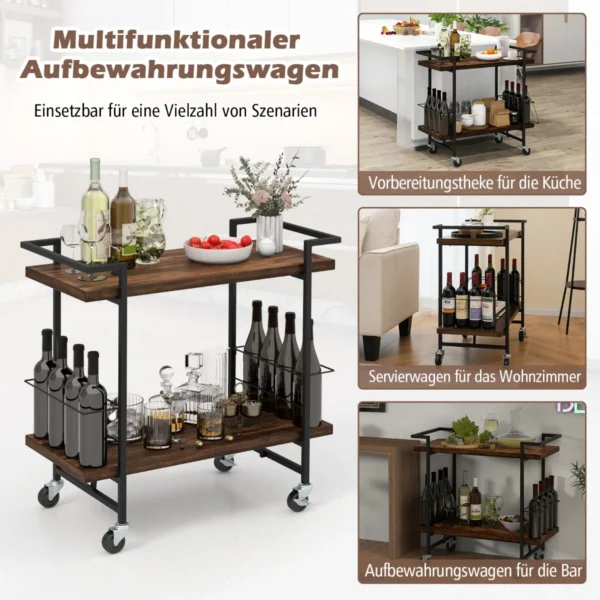 Virtuvės vežimėlis 81,5×40,5×80 cm rudos ir juodos spalvos yra praktiškas sprendimas maisto ruošimui ir saugojimui. Dėl tvirto metalinio rėmo ir dviejų pakopų laikymo krepšelių jis užtikrina patogų indų, maisto produktų ir kitų reikmenų organizavimą. Vežimėlis turi ratukus su stabdžiais ir lengvai valomą paviršių, todėl puikiai tinka naudoti virtuvėje ar svetainėje.