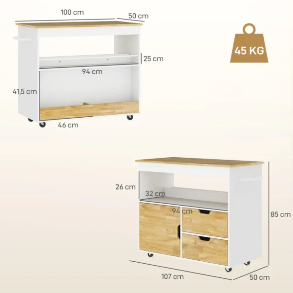 Patobulinkite savo virtuvę naudodami HOMCOM virtuvinį vežimėlį. Su elegantišku 100 x 50 cm kaučiuko medžio stalviršiu su lakuota apdaila, šis vežimėlis suteikia pakankamai vietos maistui ruošti ir yra lengvai valomas. Su dviem stalčiais, spintele su švelniai užsidarančiomis durelėmis ir keturiais skyreliais viską, ko reikia, visada turėsite po ranka, o dėl keturių universalių ratukų galėsite būti lengvai mobilūs. Idealiai tinka bet kuriam virtuvės šefui.