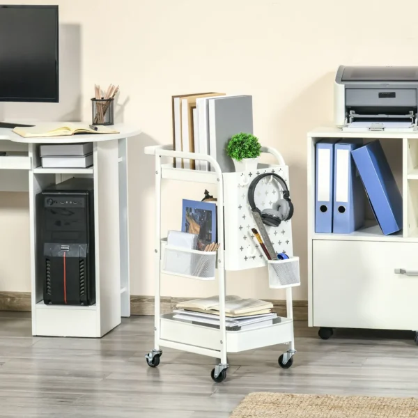 Šis HOMCOM stalčių vežimėlis yra puikus įrankis jūsų gyvenamajai ar darbo erdvei sutvarkyti ir sutvarkyti. „Pasidaryk pats“ lenta su 4 nuimamais kabliukais ir 2 skirtingų dydžių talpyklomis siūlo kūrybiškus saugojimo sprendimus, kad galėtumėte suprojektuoti virtuvės vežimėlį pagal savo stilių ir poreikius. Jums patiks lankstumas, praktiškumas ir didžiulė sandėliavimo vieta, kurią gausite su šiuo rankdarbių vežimėliu!