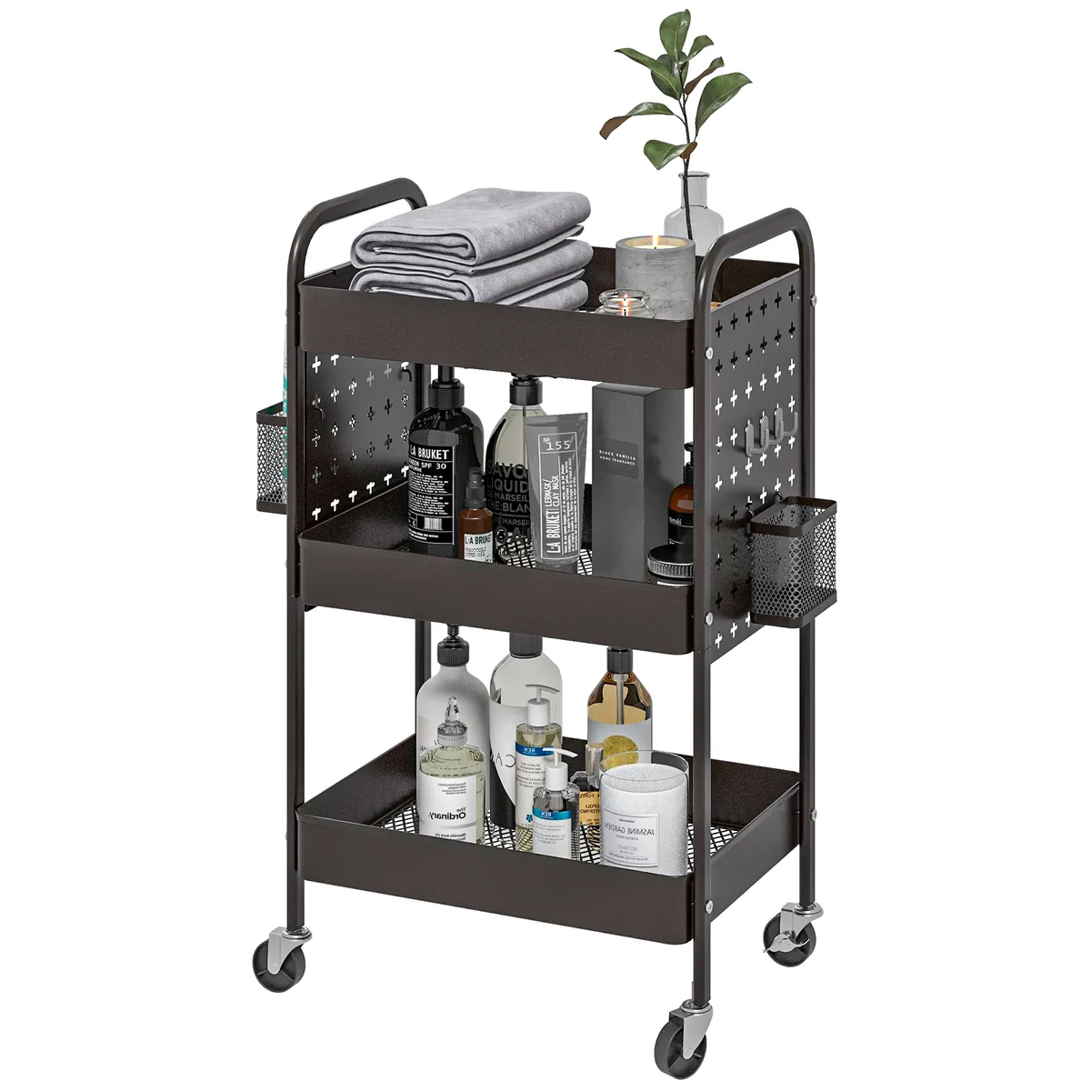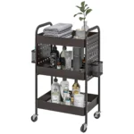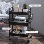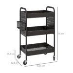 Šis kompaktiškas HOMCOM vežimėlis idealiai tinka mažoms patalpoms, kur reikia daugiau vietos. Tinkliniai krepšeliai ir šoniniai kabliukai suteikia daug vietos įvairiam maistui ar aksesuarams. Įrengtas lengvai traukiamomis rankenomis, kad būtų lengva transportuoti. Keturi sklandžiai einantys ratai su dviem stabdžiais leidžia perkelti nišinį vežimėlį kur tik reikia. Jis gali būti naudojamas kaip vonios vežimėlis, aptarnavimo vežimėlis, virtuvės vežimėlis ir skalbinių vežimėlis.