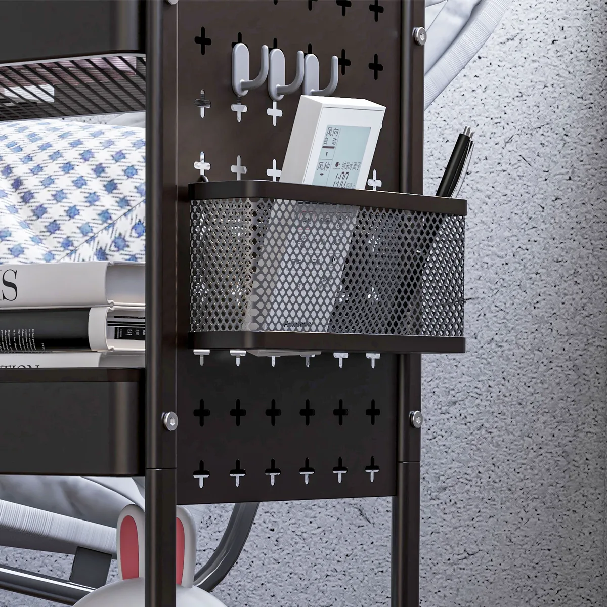 - ✔ 2 pakabinami krepšeliai ir 6 lygūs kabliukai gali būti pritvirtinti prie kairiojo arba dešiniojo laikiklio