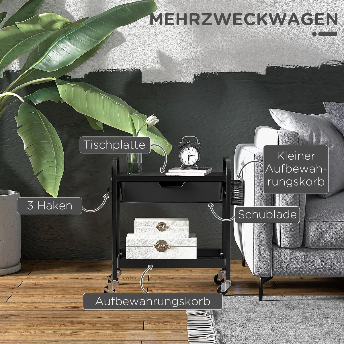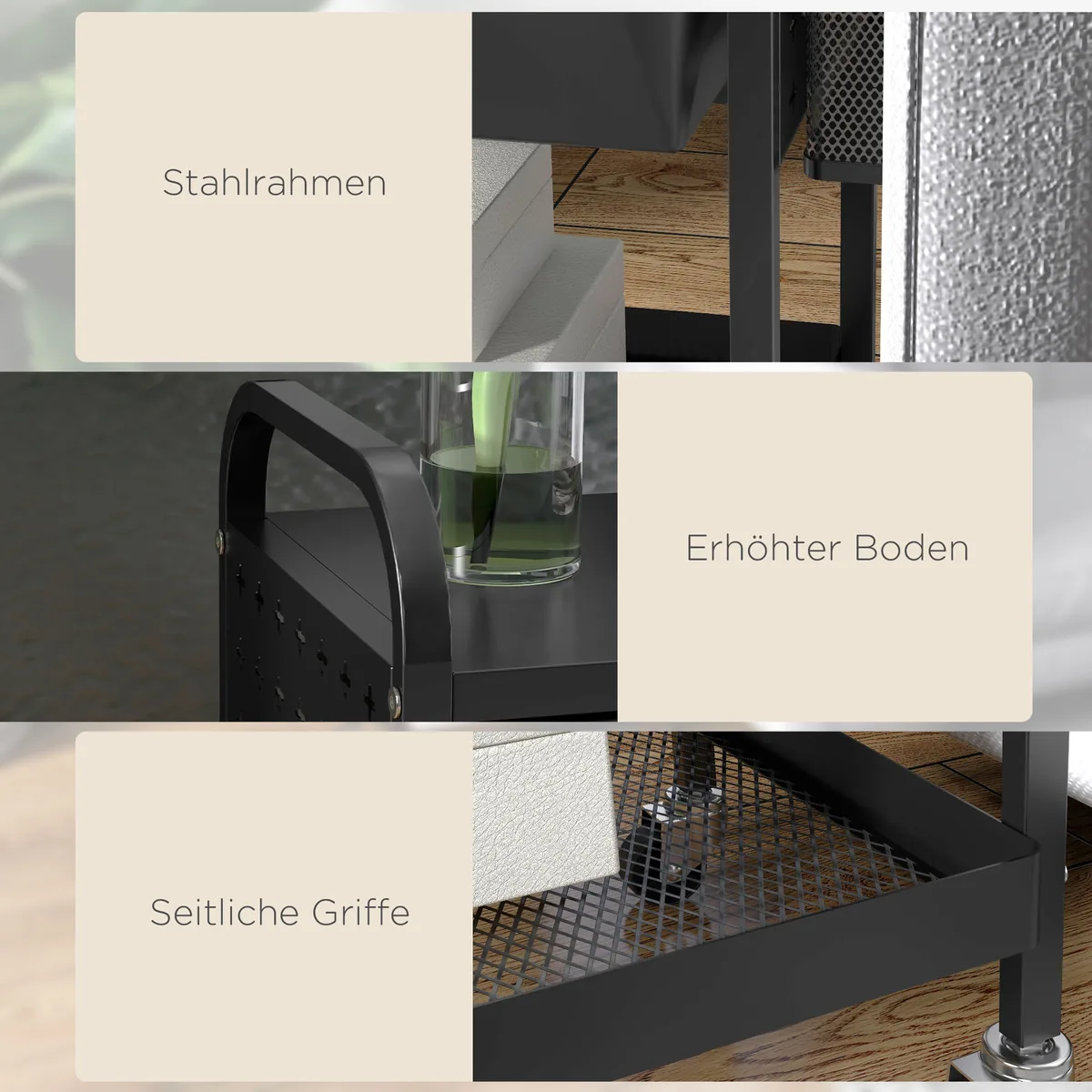 Šis HOMCOM vežimėlis yra kompaktiškas, todėl puikiai tinka mažoms patalpoms, kurioms reikia daugiau vietos. Apatinė lentyna, stalčius, šoniniai kabliukai ir mažas krepšelis suteikia daug vietos įvairiems priedams. Įrengtos lygios rankenos, užtikrinančios sklandų judėjimą. Keturi sklandžiai einantys ratai ir stovėjimo stabdžiai leidžia perkelti vežimėlį kur tik reikia. Jis gali būti naudojamas kaip serviravimo vežimėlis, virtuvės vežimėlis ir universalus vežimėlis. Praktiškas daiktų laikymo sprendimas jūsų namams.