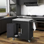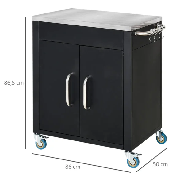 Palyginti su įprastu mediniu virtuvės stalviršiu, šį iš geležies pagamintą stalą lengviau valyti ir lengviau laikyti. Dėl dėmesingo dizaino vienas šoninis skydelis buvo paliktas, todėl ruošdami maistą galėsite lengvai pasiekti priedus. Šeši chromuoti kabliukai suteikia vietos virtuvės reikmenims laikyti. Jūsų laukia kompaktiškas ir pilnai funkcionalus virtuvės salelės vežimėlis.
