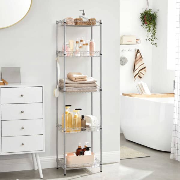 Vonioje? MAGAS: Rankšluosčius, šampūnus, losjonus, vonios druskas ir kitus tualeto reikmenis laikykite 5 aukštuose, o šepečius pakabinkite ant kabliukų – stebuklingai padidinsite kadaise sausakimšą vonios kambarį! Beje, vielinio krepšelio dizainas apsaugo jūsų daiktus nuo kritimo.