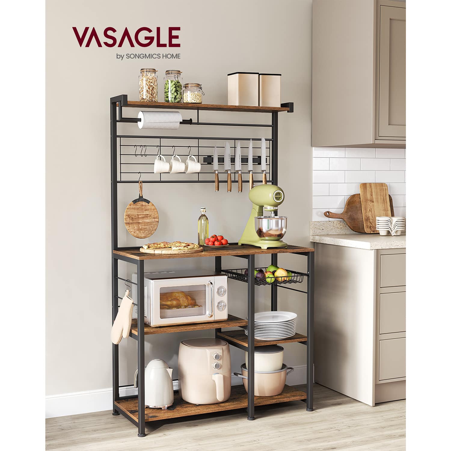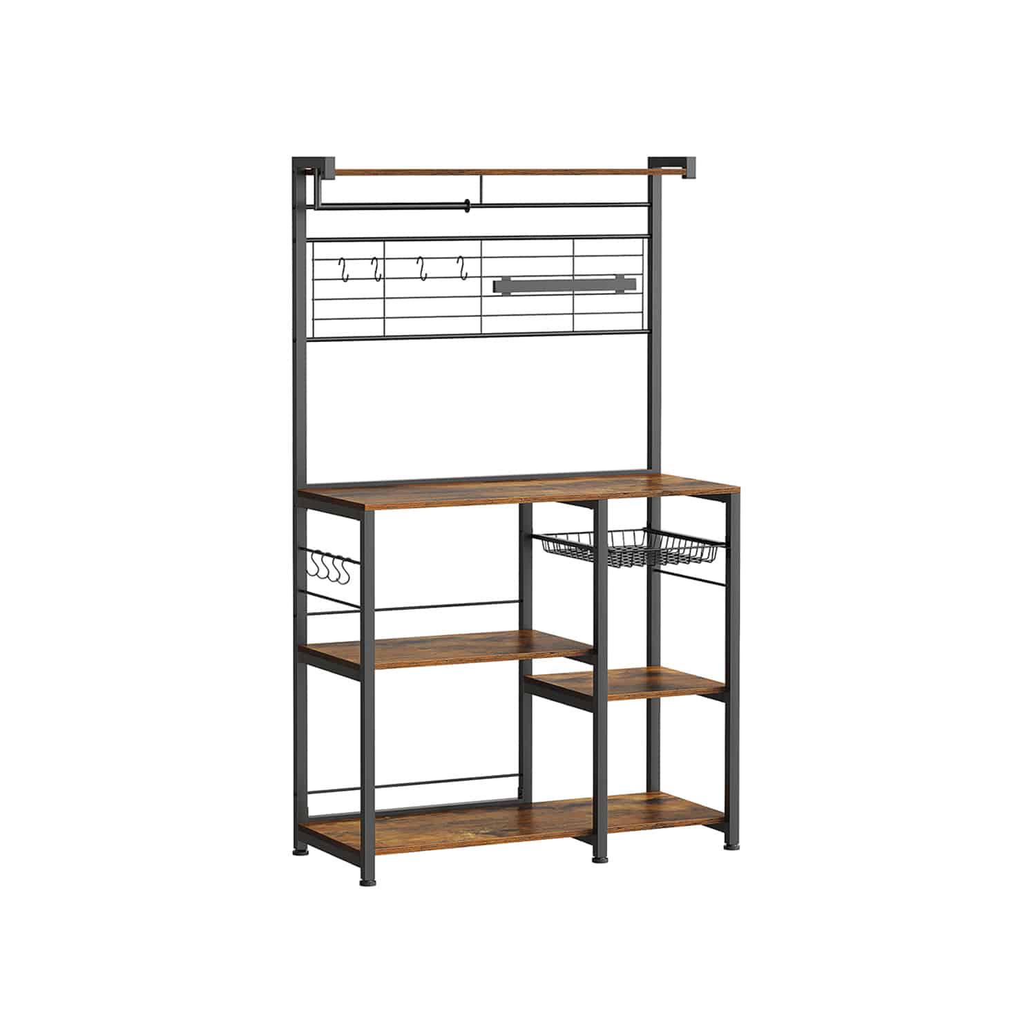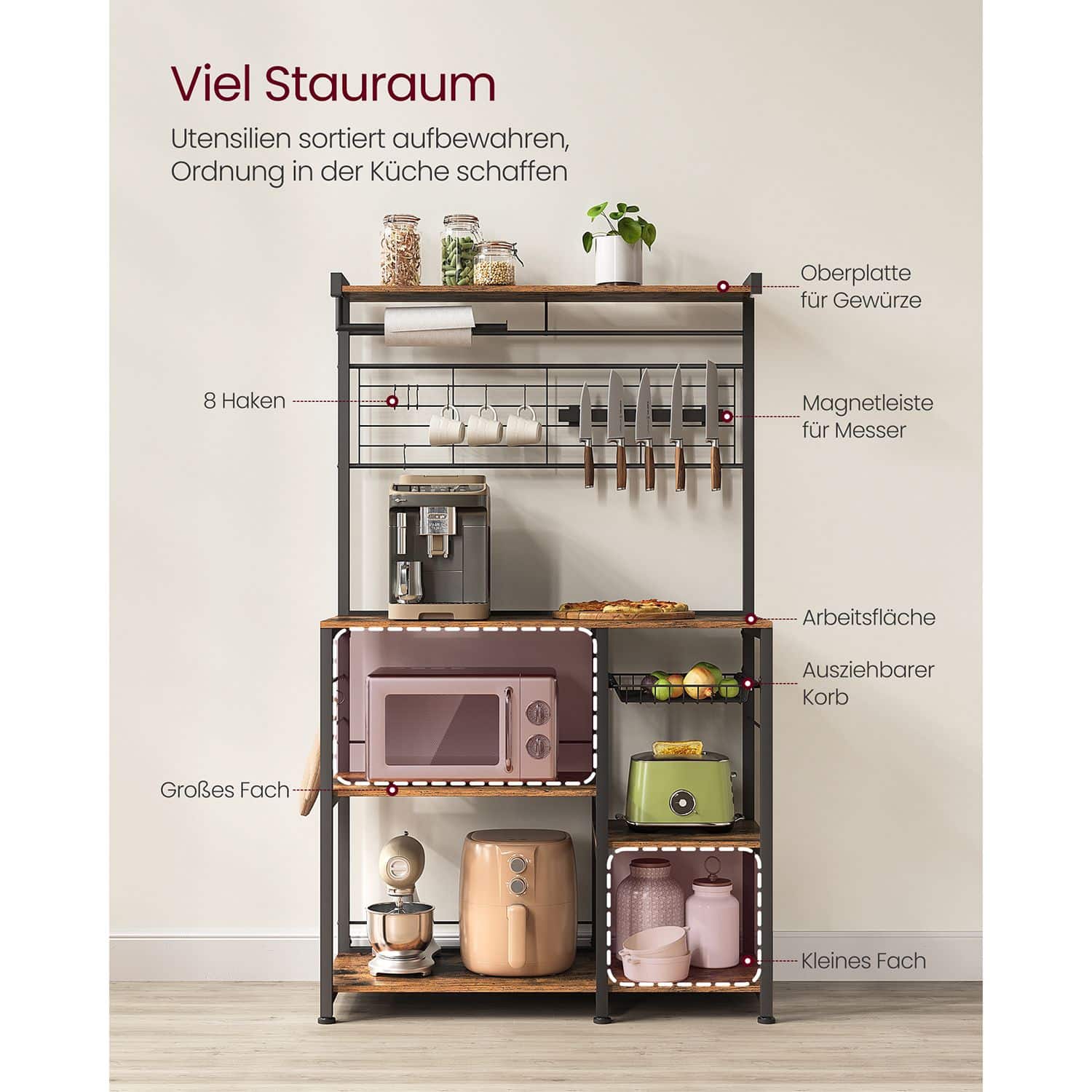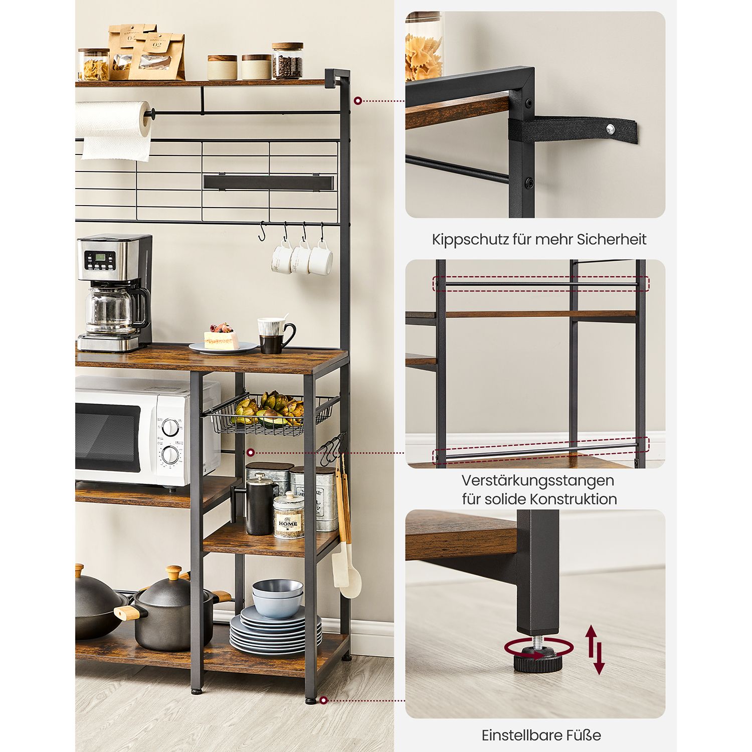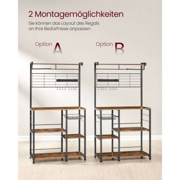 Virtuvinė lentyna turi kelias lentynas ir krepšius, kurie leidžia patogiai laikyti įvairius virtuvės reikmenis. Viršutinė plokštė gali atlaikyti iki 18 kg, darbinis paviršius – iki 54,5 kg, didelė lentyna vidurinėje dalyje – iki 36 kg, maža lentyna – iki 18 kg, o didelė lentyna apatinėje srityje – iki 55 kg. Vielos krepšys gali atlaikyti iki 10 kg, kabliukai – po 5 kg kiekvienas, virtuvės ritinio laikiklis – iki 5 kg, o magnetinė juostelė peiliams – iki 3 kg.