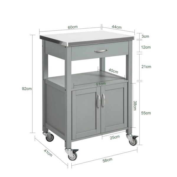 Virtuvinė spinta ant ratų 60x44x92cm, pilkos/sidabrinės spalvos, yra puikus sprendimas jūsų virtuvės erdvės optimizavimui. Ši spinta suteikia papildomą laikymo, darbastalio ir darbo vietą, todėl ji yra itin funkcionali ir praktiška.
