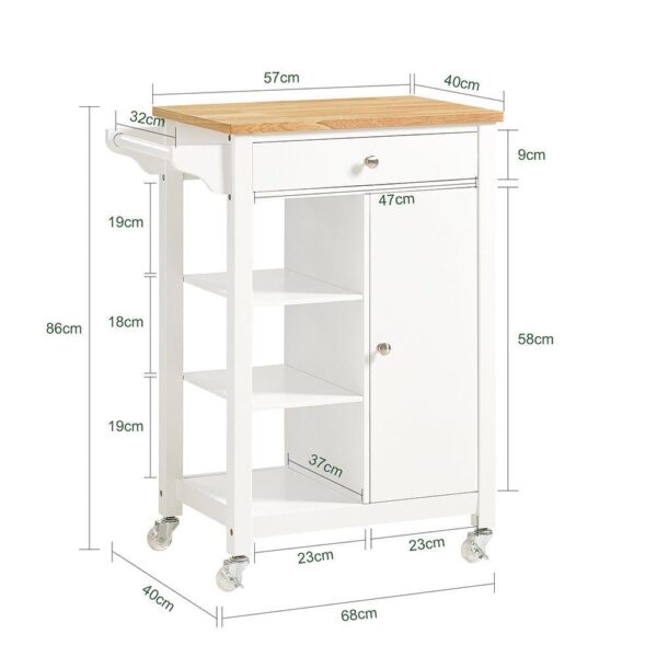 Virtuvinė spinta ant ratų 68x40x86 cm, baltos/šviesiai rudos spalvos, yra puikus sprendimas jūsų virtuvės organizavimui. Šis tvirtas ir patikimas laikymo sprendimas atsparus drėgmei, purvui ir sunkiai apkrovai, suteikdamas papildomą laikymo, atidėjimo ir darbo vietą.