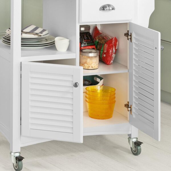 Ši virtuvinė spinta ant ratų 71x45x94 cm, baltos/sidabrinės spalvos, yra puikus sprendimas jūsų virtuvei. Ji suteikia papildomą laikymo, darbastalio ir darbo vietą, kurią lengva pritaikyti pagal jūsų poreikius.