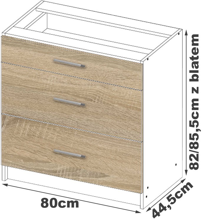 Virtuvės spintelė S80 SZ3 yra vienas iš daugybės klientams patikusių Lima kolekcijos pasiūlymų. Ji suteikia daug vietos virtuvėje susidėti reikalingiems daiktams – tiek maistui, tiek indams, stalo įrankiams ar smulkiems dalykėliams, palengvinantiems patiekalų ruošimą. Spintelė susideda iš trijų stalčių. Balduose dera dvi labai madingos ir praktiškos spalvos, kurios neabejotinai yra balta ir sonoma ąžuolas. Ryškios rankenos puikiai papildo visumą. Tiek pristatoma pastatoma spintelė, tiek kiti Lima kolekcijos baldai pagaminti iš laminuotos plokštės, kuri užtikrina ilgaamžiškumą ir atsparumą dilimui. Spintelė su stalčiais yra nepamainomas elementas bet kurioje virtuvėje. Raginame susipažinti su šiuo ir kitais Lima kolekcijos pasiūlymais ir pasirinkti tinkamiausius variantus jūsų virtuvei. Korpuso spalva – balta Priekinės dalies spalva – Sonoma ąžuolas p> – Spintelė iš dilimui atsparios laminuotos plokštės. – Baltas stalviršis su sidabro apvadu NEMOKAMAI!!!