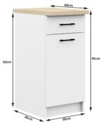 Nesenstančios ir labai universalios baltos spalvos virtuvės spintelė. Šiuolaikinės matinės juodos spalvos rankenos užtikrina ilgą ir be rūpesčių naudojimą. Spintelė S50 1D 1S turi talpų stalčių virtuvės reikmenims ir dureles, o viduje – lentynėlę, kurioje tilps kuo daugiau papildomų virtuvės reikmenų. Pridedamas spintelei skirtas stalviršis į įsigytą spintą. Stalviršis pagamintas iš laminuotos plokštės, jo matmenys yra 50 cm / 60 cm