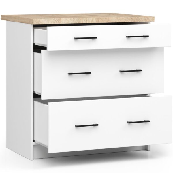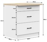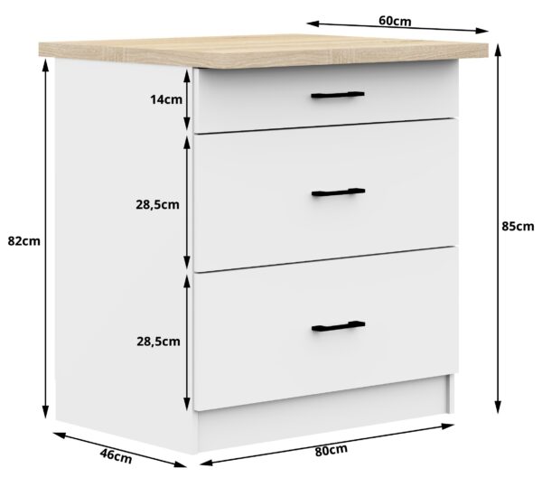 S 80 cm 3S virtuvės spintelė yra „Oliwia“ kolekcijos pasiūlymas. Jo dėka bus galima sukurti gražią, funkcionalią virtuvę. Baltos spalvos baldai buvo labai populiarūs ilgą laiką. Nieko keisto – jie gražiai atrodo bet kurioje patalpoje, yra lengvai valomi ir praktiški. Balta spintelė, susidedanti iš trijų stalčių, tikrai puikiai tiks bet kurioje virtuvėje, suteikianti daug vietos būtiniausiems daiktams – stalo įrankiams, indams, taip pat valymo priemonėms ir maistui susidėti. Baldai pasižymi dideliu atsparumu dilimui, yra patvarūs ir malonūs akiai. Pasiūlymą rasite mūsų internetinėje parduotuvėje už puikią kainą, o spintelę galima priderinti prie kitų modernios „Oliwia“ kolekcijos elementų, kurie leis sukurti derančią visumą. Stalviršis skirtas. prie spintos pridedama prie nupirktos spintos. Viršutinė dalis pagaminta iš laminuotos plokštės, jos matmenys 80cm / 60cm