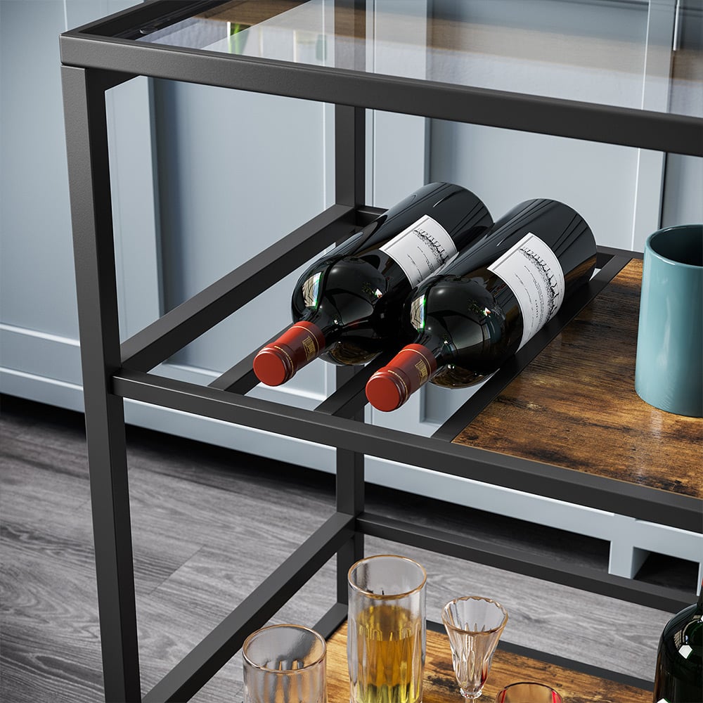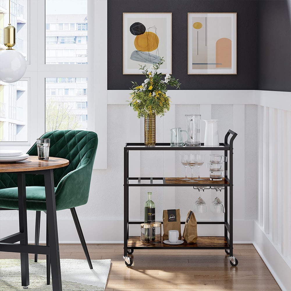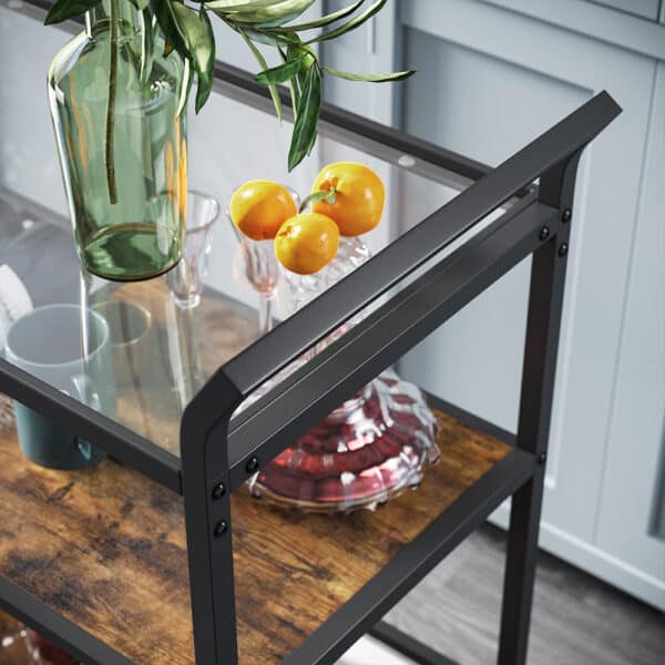 Tegul vakarėlis prasideda! Gėrimai, užkandžiai… Sudėkite visas gėrybes į šį vežimėlį ir nustebinkite savo svečius. Pietūs patiekiami! Lengvai perneškite indus, lėkštes ir stalo įrankius į valgomąjį, kad sukurtumėte jaukią šeimos vakarienės atmosferą. Stiklinis viršus šiam vežimėliui suteikia ypatingo žavesio, o lenkta rankena paverčia jūsų namus 5 žvaigždučių viešbučiu.