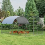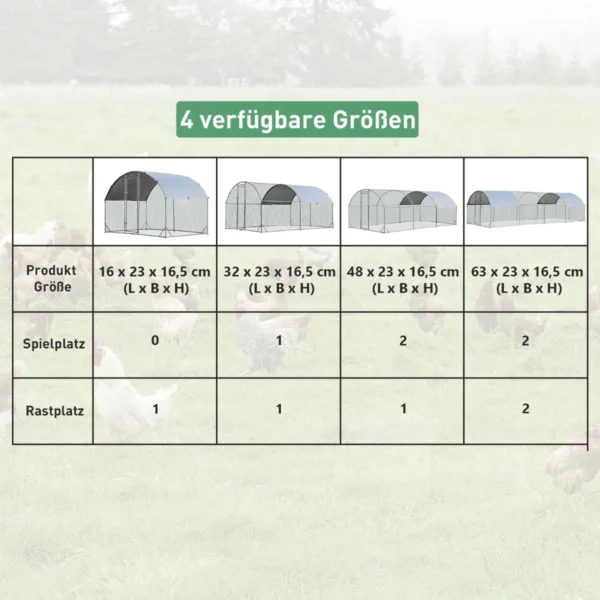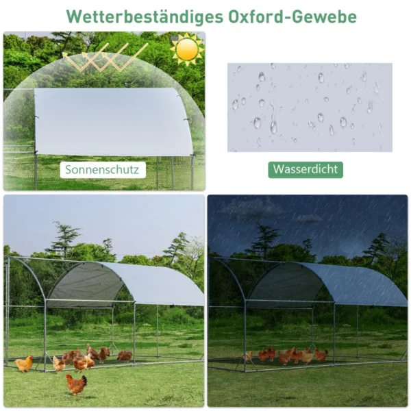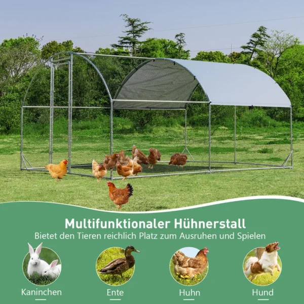 Vištidė 380x280x195 cm sidabrinės spalvos skirta užtikrinti saugią ir patogią laikyseną vištoms, antims, triušiams ir kitiems smulkiems gyvūnams. Tvirtas cinkuoto plieno rėmas bei vandeniui atsparus Oksfordo audinys leidžia naudoti vištidę lauke įvairiomis oro sąlygomis.