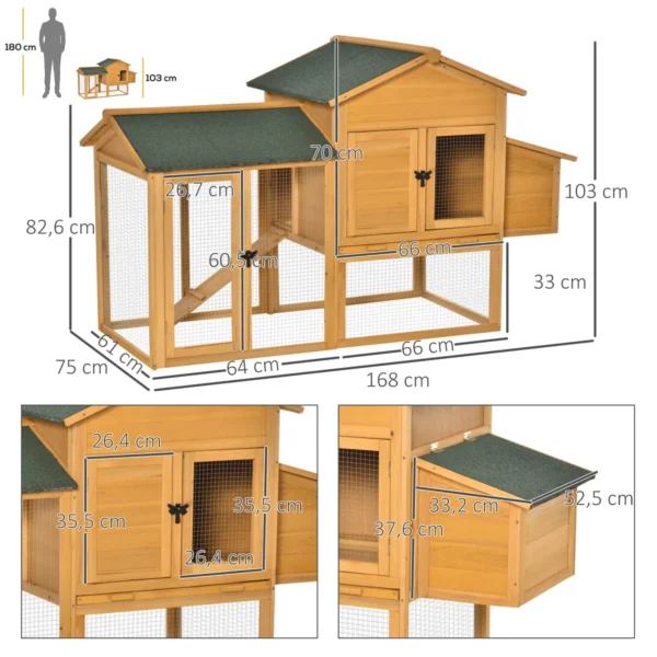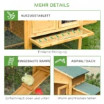 Šis modernus „PawHut“ bantamų kooperatyvas yra idealus namas jūsų bantams! Poilsio kambarys, inkubatorius ir didelė bėgimo zona suteikia jūsų bantams daug vietos veisimuisi, pešimui ir bėgimui. Inkubatorius turi atverčiamą stogą, kad būtų galima atsargiai išimti kiaušinius. Dėl pagrindinio dėklo narvelį lengva valyti. „Bantam Coop“ taip pat yra atsparus oro sąlygoms ir vandeniui.